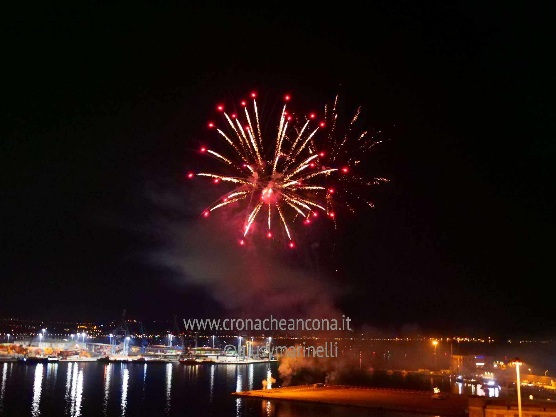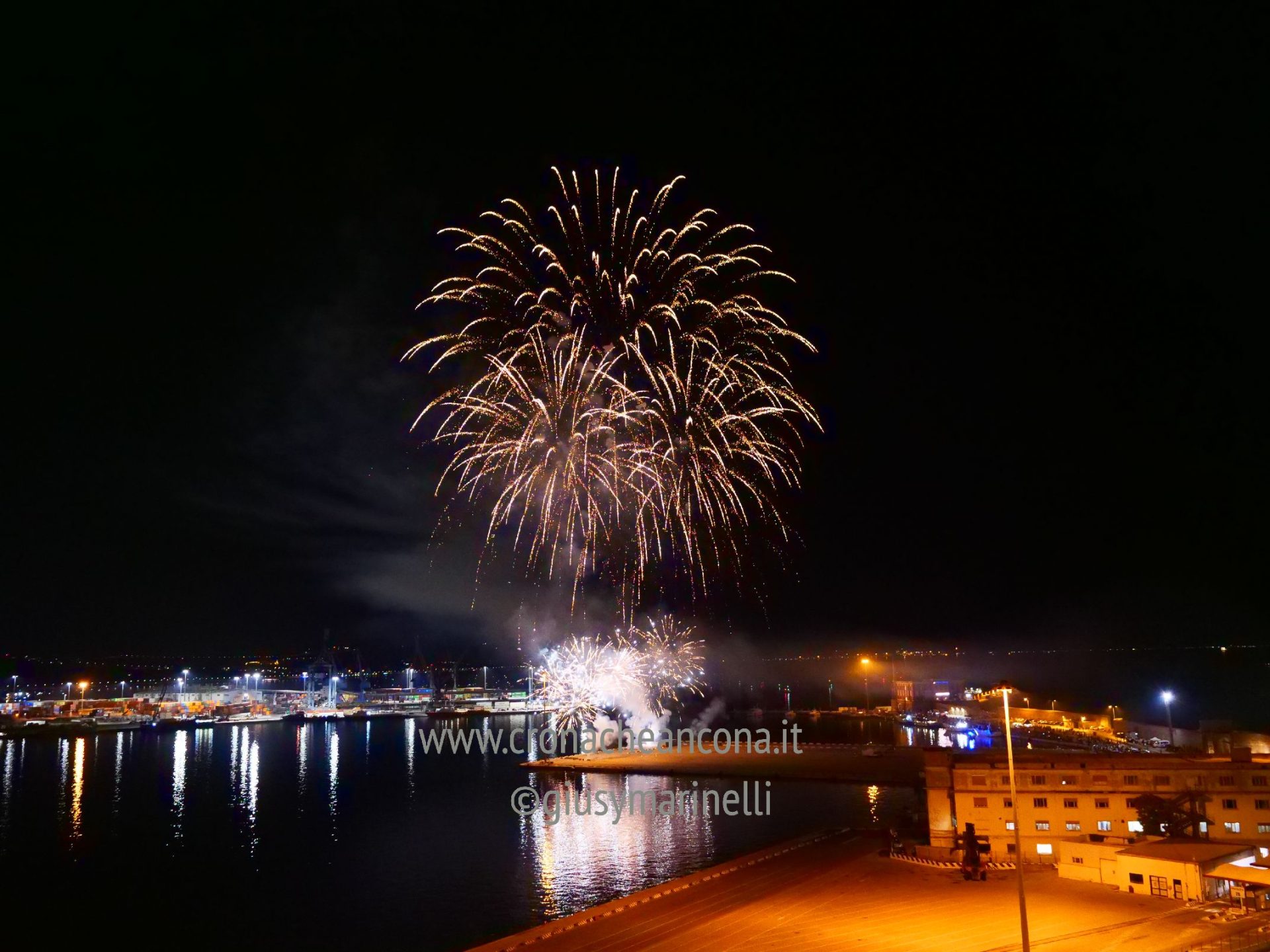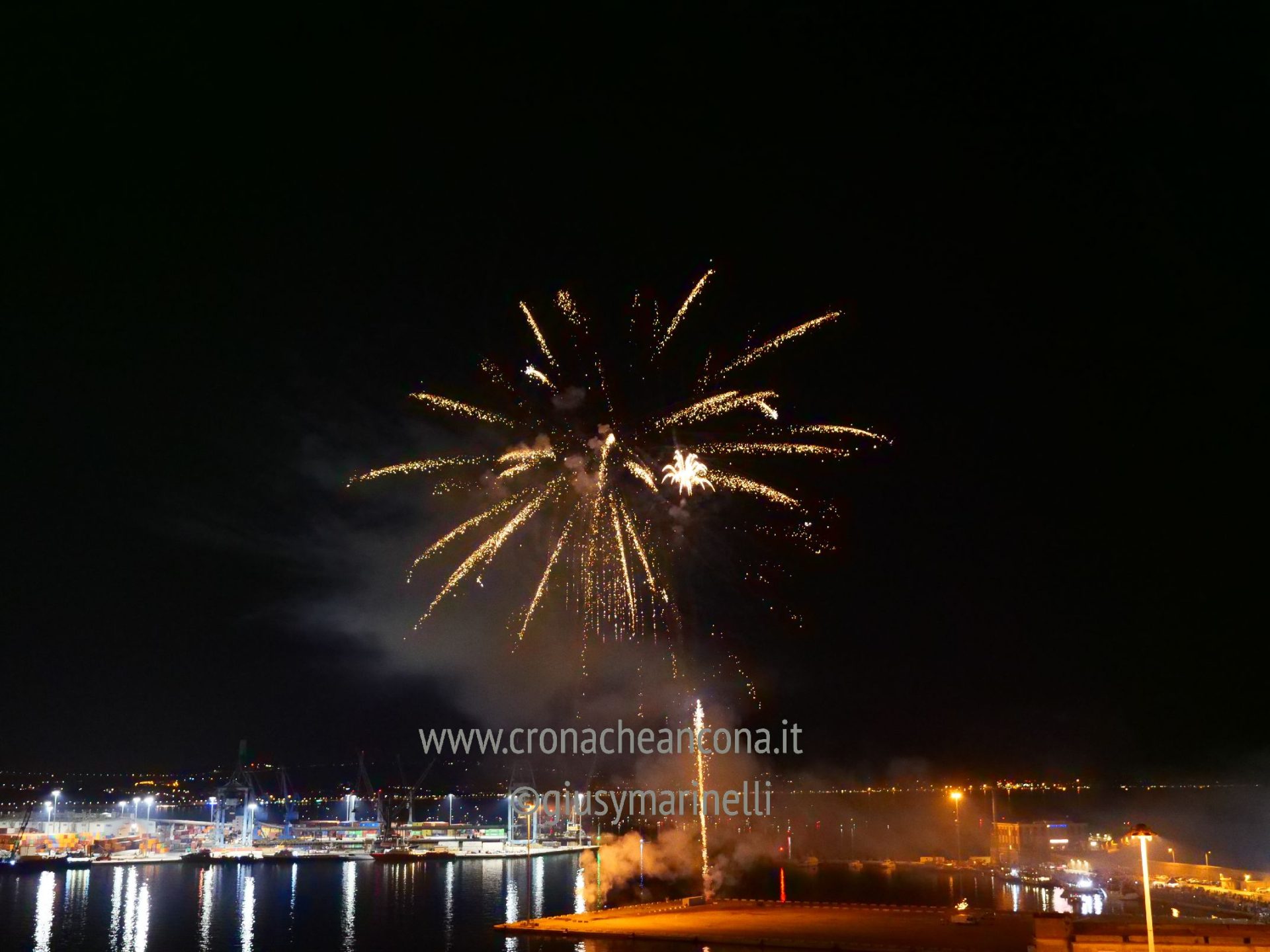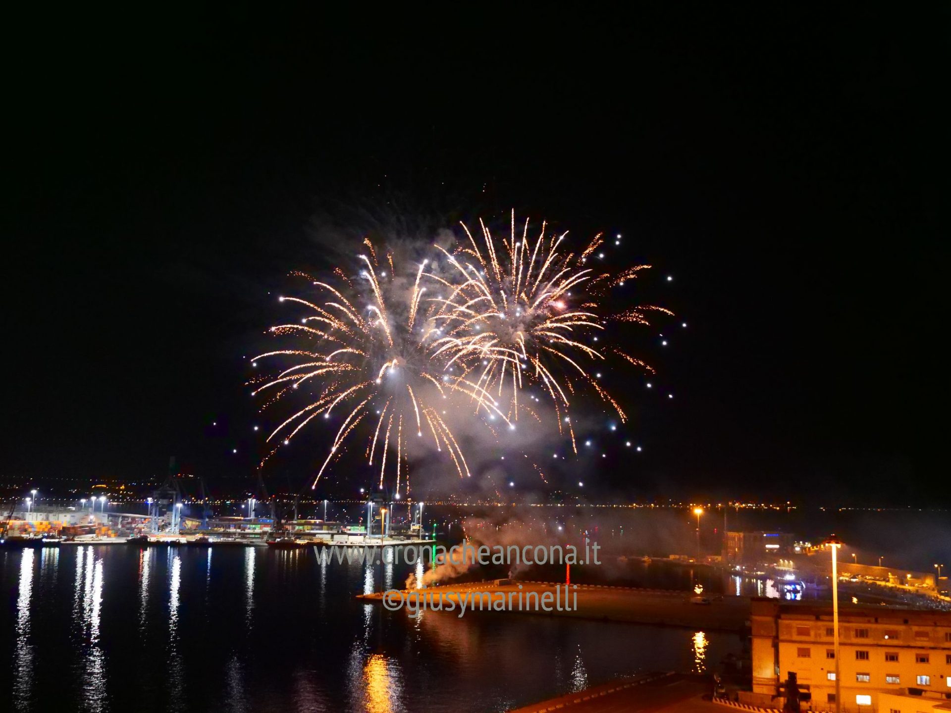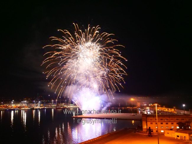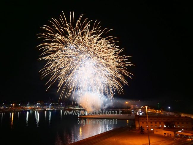Allestiti della ditta Fonti Pirotecnica Srl di Riccione, i fuochi di artificio hanno iniziato ad illuminare il cielo della città alle 22,30. Per la realizzazione di questo spettacolo sono stati utilizzati circa 12 mila effetti diversi, tra cui alcune figure che costituiscono delle novità in campo pirotecnico, esclusive per Ancona. La gestione è avvenuta con una centralina informatizzata che ha coordinato, attraverso diverse postazioni informatiche, 1.200 detonatori a terra per far partire lo spettacolo in sincrono, per un crescendo di giochi luminosi e quadri monocromatici a 150 metri di altezza.