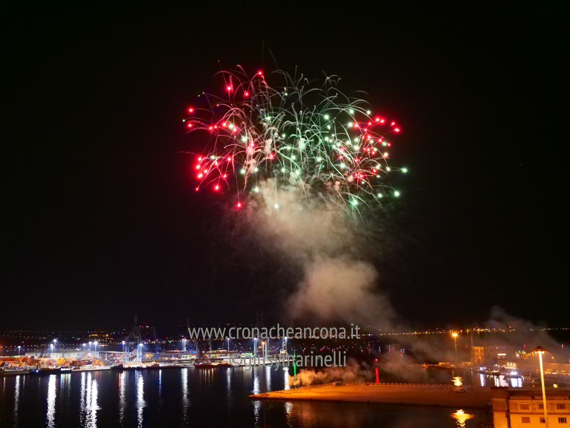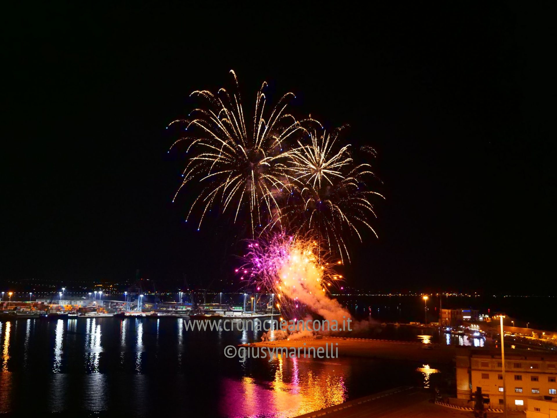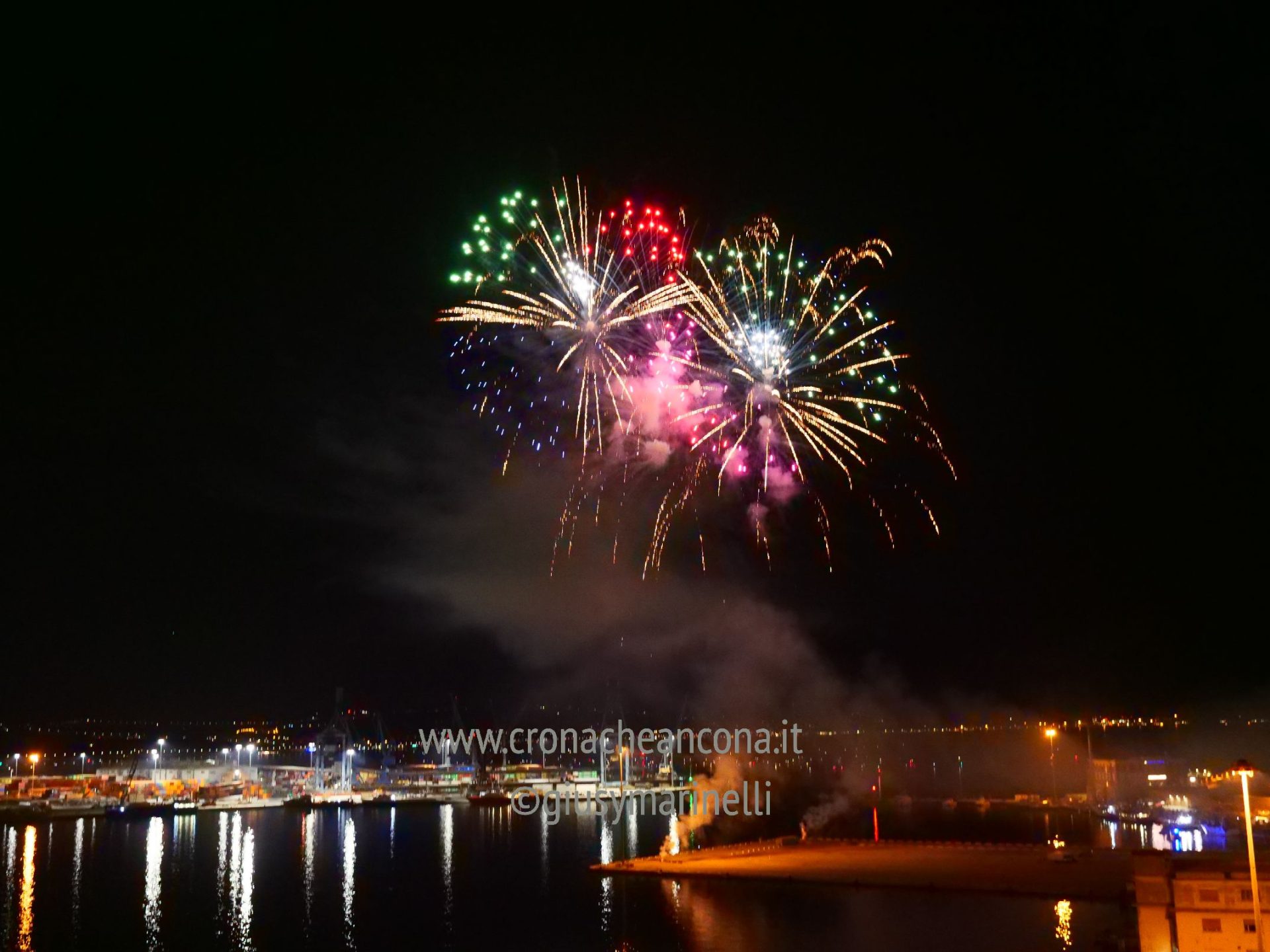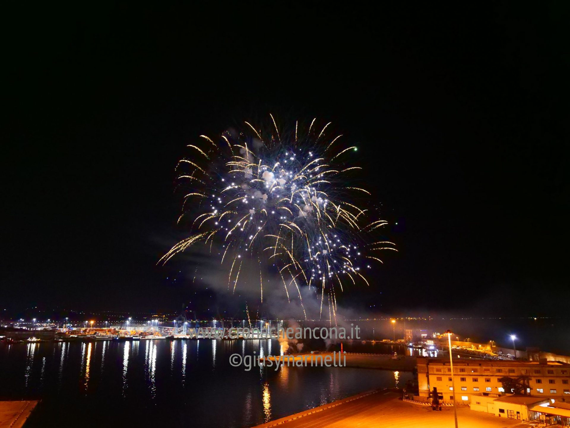 Allestiti della ditta Fonti Pirotecnica Srl di Riccione, i fuochi di artificio hanno iniziato ad illuminare il cielo della città alle 22,30. Per la realizzazione di questo spettacolo sono stati utilizzati circa 12 mila effetti diversi, tra cui alcune figure che costituiscono delle novità in campo pirotecnico, esclusive per Ancona. La gestione è avvenuta con una centralina informatizzata che ha coordinato, attraverso diverse postazioni informatiche, 1.200 detonatori a terra per far partire lo spettacolo in sincrono, per un crescendo di giochi luminosi e quadri monocromatici a 150 metri di altezza.