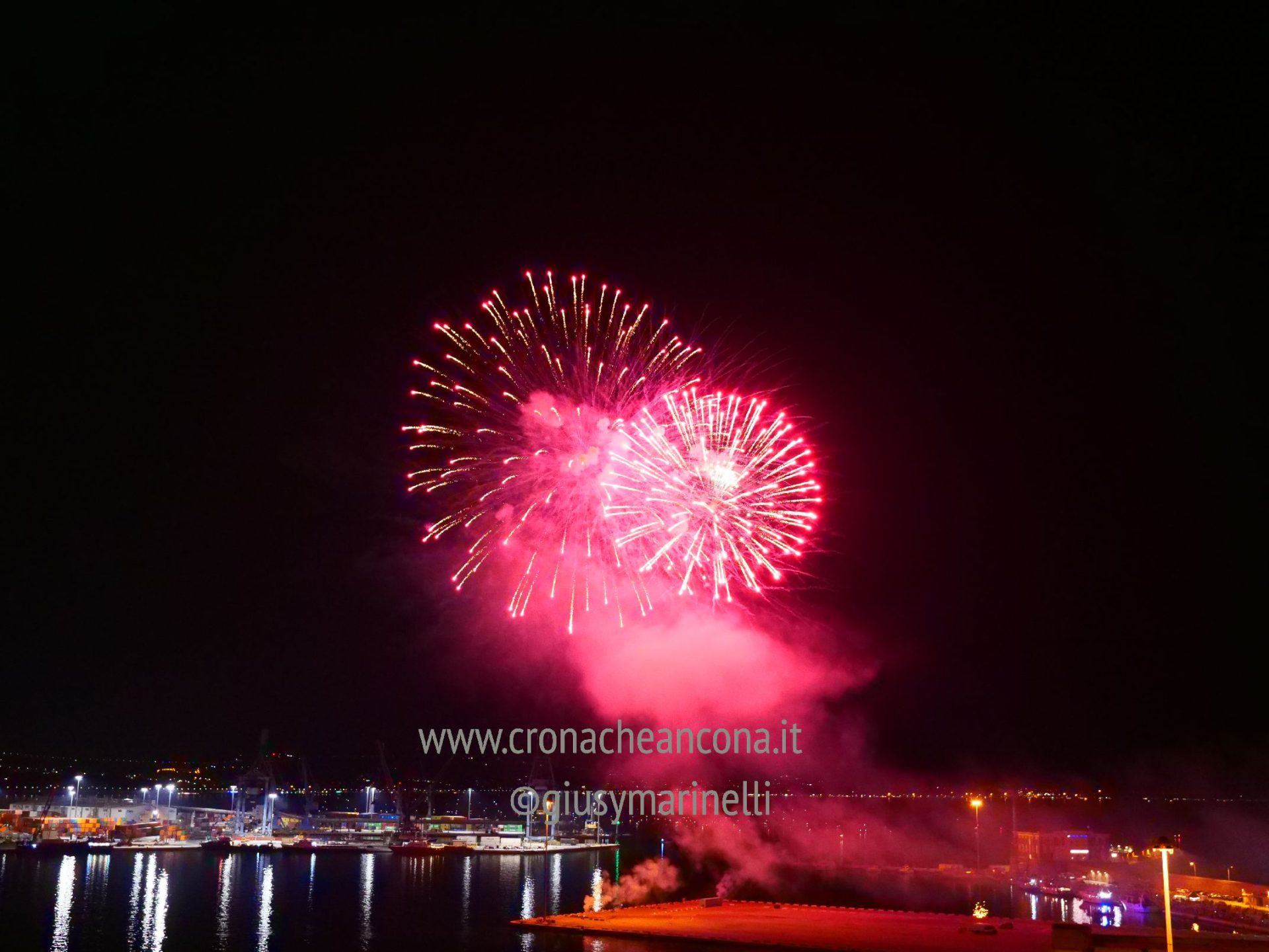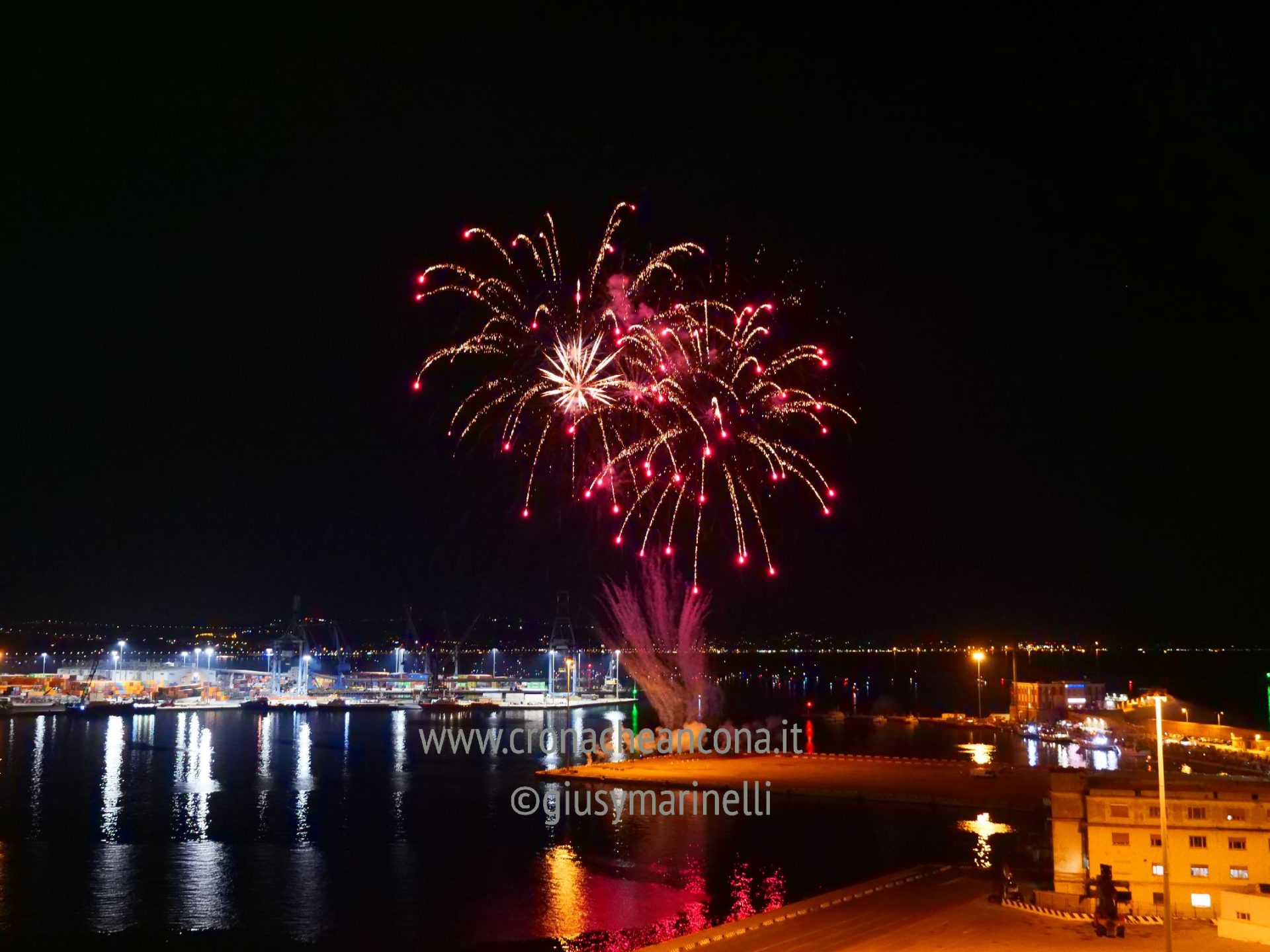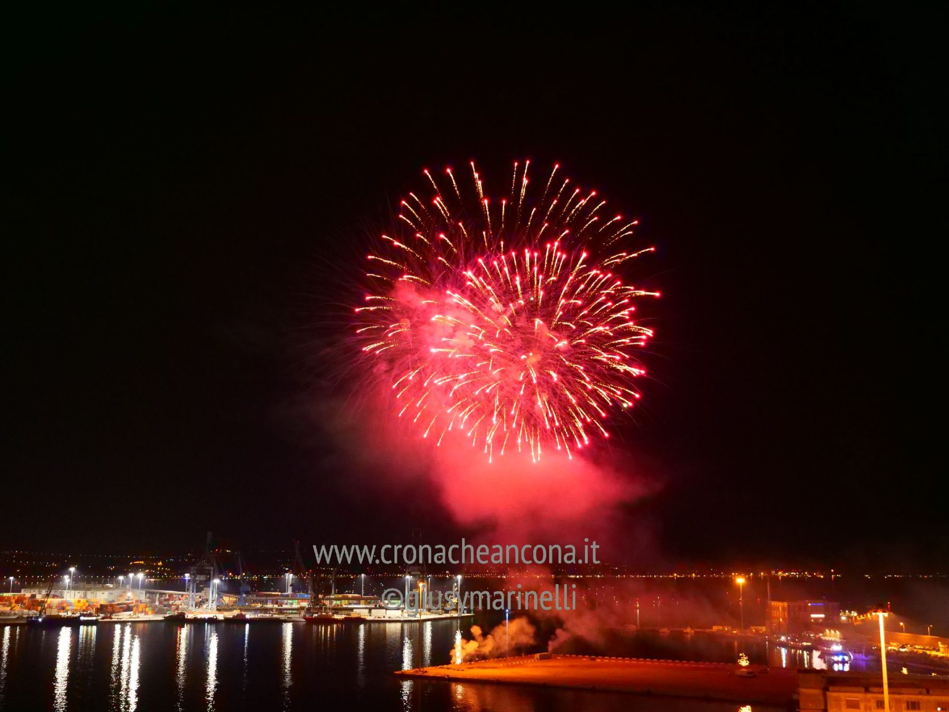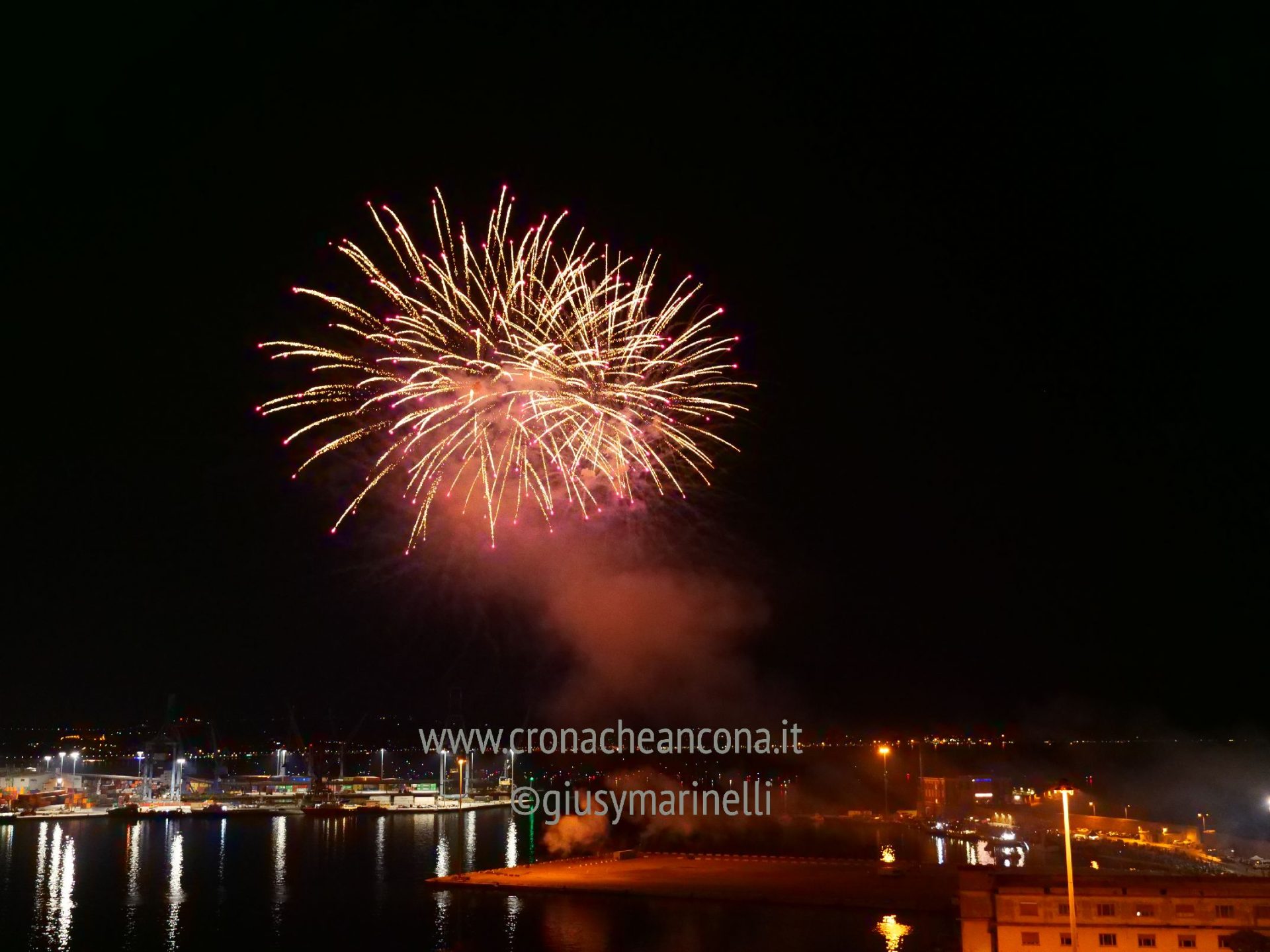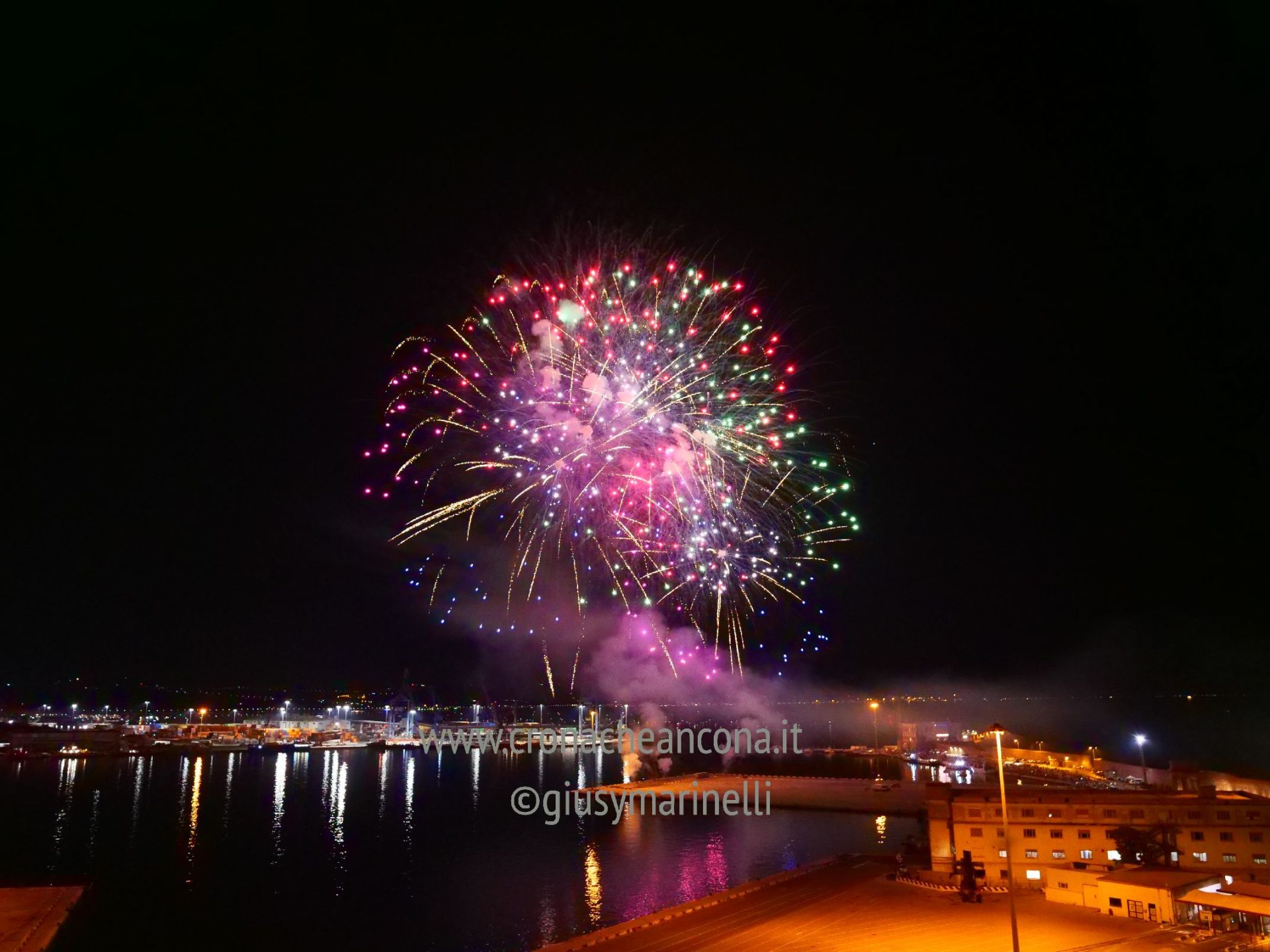 Allestiti della ditta Fonti Pirotecnica Srl di Riccione, i fuochi di artificio hanno iniziato ad illuminare il cielo della città alle 22,30. Per la realizzazione di questo spettacolo sono stati utilizzati circa 12 mila effetti diversi, tra cui alcune figure che costituiscono delle novità in campo pirotecnico, esclusive per Ancona. La gestione è avvenuta con una centralina informatizzata che ha coordinato, attraverso diverse postazioni informatiche, 1.200 detonatori a terra per far partire lo spettacolo in sincrono, per un crescendo di giochi luminosi e quadri monocromatici a 150 metri di altezza.