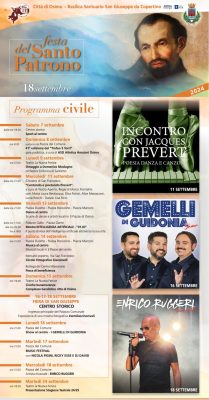 E’ il secondo evento (sono tutti ad ingresso gratuito) inserito nel cartellone, reso noto oggi dall’Amministrazione comunale, dopo lo show dei Gemelli di Guidonia in programma per il 16 settembre. Le feste josephine entreranno nel clou nei giorni dal 17 al 18 settembre con la mostra mercato in centro storico, il luna park e tante iniziative civili e religiose in onore del santo di cui la città custodisce le spoglie. La cerimonia di consegna delle civiche benemerenze è prevista per il 15 settembre, alle ore 18, al teatro La Nuova Fenice, mentre la serata del 17 settembre sarà animatain centro storico dai dj Nicola Pigini, RicKy Esse e Dj David.
