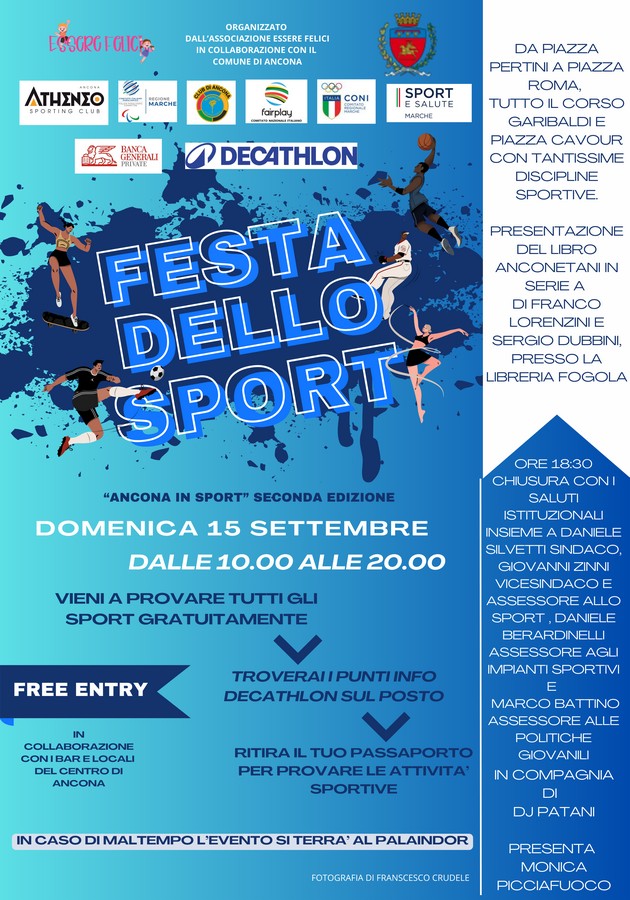 «Con la Festa dello Sport, o meglio degli Sport – ha sottolineato Zinni – la città festeggia l’impegno che le associazioni compiono ogni anno per avvicinare i giovani e i giovanissimi di Ancona ai tanti indirizzi sportivi, agonistici e non, promossi nel mese di settembre in stretta correlazione con l’inizio dell’anno scolastico. E’ un evento che nasce dalla collaborazione con Monica Picciafuoco della associazione “Essere Felici” e che si è trasformato in un progetto più ampio dedicato a coloro che animano e amano lo sport anconetano e che vuole essere cassa di risonanza del grande lavoro da associazioni, federazioni e enti di promozione, non da tutti conosciuto. Una Festa dello Sport già esiste, quella del Coni: senza entrare mai nelle scelte delle società sportive, l’evento dell’Amministrazione si candida a promuovere lo sport nei suoi valori assoluti e quale antidoto alle tossicodipendenze e ad ogni tipo di dipendenza che affigge i giovani di oggi. Da aggiungere che la Festa, per la quale si è investito un budget contenuto, 15mila euro, preferendo destinare più aiuti possibili alle società, si sposa perfettamente con il grande evento velico cittadino, la Regata del Conero organizzata da oltre due decenni da Marina Dorica e con il grande tema della Salute che vede Ancona protagonista con il G7 Salute e i tanti eventi collaterali».