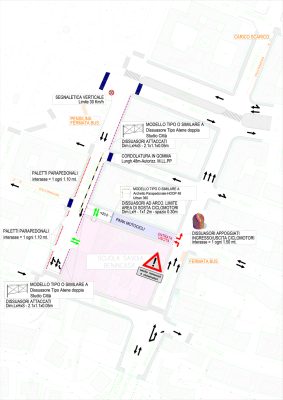 In via Palestro la zona sarà interdetta alla circolazione per una lunghezza di 20 metri lineari dall’intersezione con via Vecchini; è prevista la creazione di un’area di sosta riservata a motocicli e ciclomotori nel tratto compreso tra il limite della zona interdetta e via Giannelli; l’apposizione di dissuasori di sosta tra la zona interdetta e l’area di sosta per motocicli e ciclomotori; l’apposizione di dissuasori da posizionare all’intersezione con via Giannelli al fine di delimitare l’ingresso e l’uscita dei motocicli e ciclomotori; la creazione di uno stallo tecnico bus e di 2 stalli dedicati alle persone con disabilità nel tratto compreso tra via Vecchini e via Camerini sul lato destro. Anche in questa area è prevista la realizzazione di un attraversamento pedonale all’intersezione con via Vecchini, l’obbligo di svolta a sinistra e stop da posizionare all’intersezione con via Giannelli sul lato sinistro.