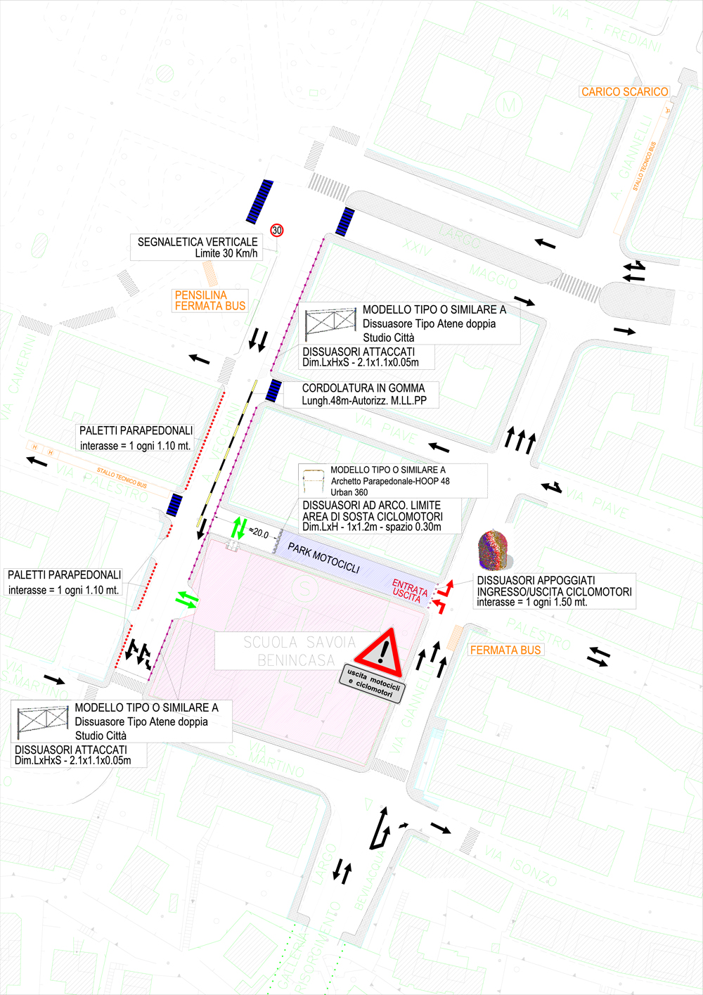 Il Piazza Cavour inoltre sarà realizzato un attraversamento pedonale tra l’isola spartitraffico (posta tra Largo XXV Maggio e Piazza Cavour) e l’area verde lato ex Palazzo Inps. Strisce pedonali anche in via Piave all’intersezione con via Vecchini. In via Vecchini è prevista l’apposizione di segnaletica verticale indicante limite 30 km/h da posizionare all’intersezione con Piazza Cavour lato destro; la creazione di un cordolo delimitatore, sulla corsia di sinistra, dall’intersezione con via Piave all’angolo dell’Istituto Savoia-Benincasa (all’altezza di Via Palestro), l’obbligo di proseguire diritti all’intersezione con via Palestro da posizionare nella corsia di sinistra; l’apposizione di paletti parapedonali nel tratto compreso tra largo XXIV Maggio e Via San Martino in entrambi i lati.