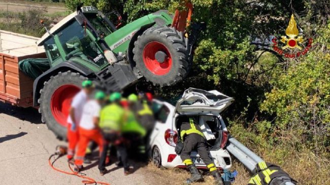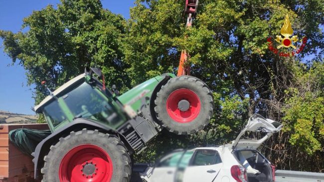 Un trattore è finito con la parte anteriore sopra ad una vettura. La donna che si trovava al volante dell’utilitaria è rimasta incastrata nelle lamiere.