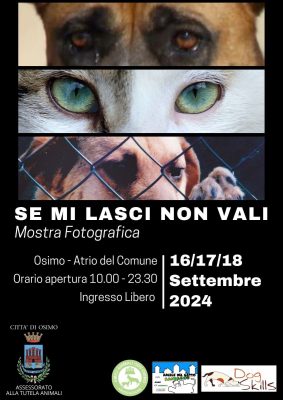 Una esposizione fotografica per raccontare i sentimenti dei nostri amici a quattro zampe. E’ inserita nel cartellone degli eventi per i festeggiamenti patronali la mostra fotografica “Se mi lasci non vali”, in programma dal 16 al 18 settembre presso l’atrio del Comune di Osimo, e affronta il delicato tema dell’abbandono degli animali. L’esposizione, ad ingresso libero e apertura dalle ore 10 alle 23.30, è organizzata in collaborazione con varie associazioni locali come ‘Amici Animali Osimo Odv’, ‘Amici del Gatto Randagio’ e ‘Dog Skills’, con il patrocinio dell’Assessorato alla Tutela Animali della città di Osimo.