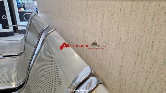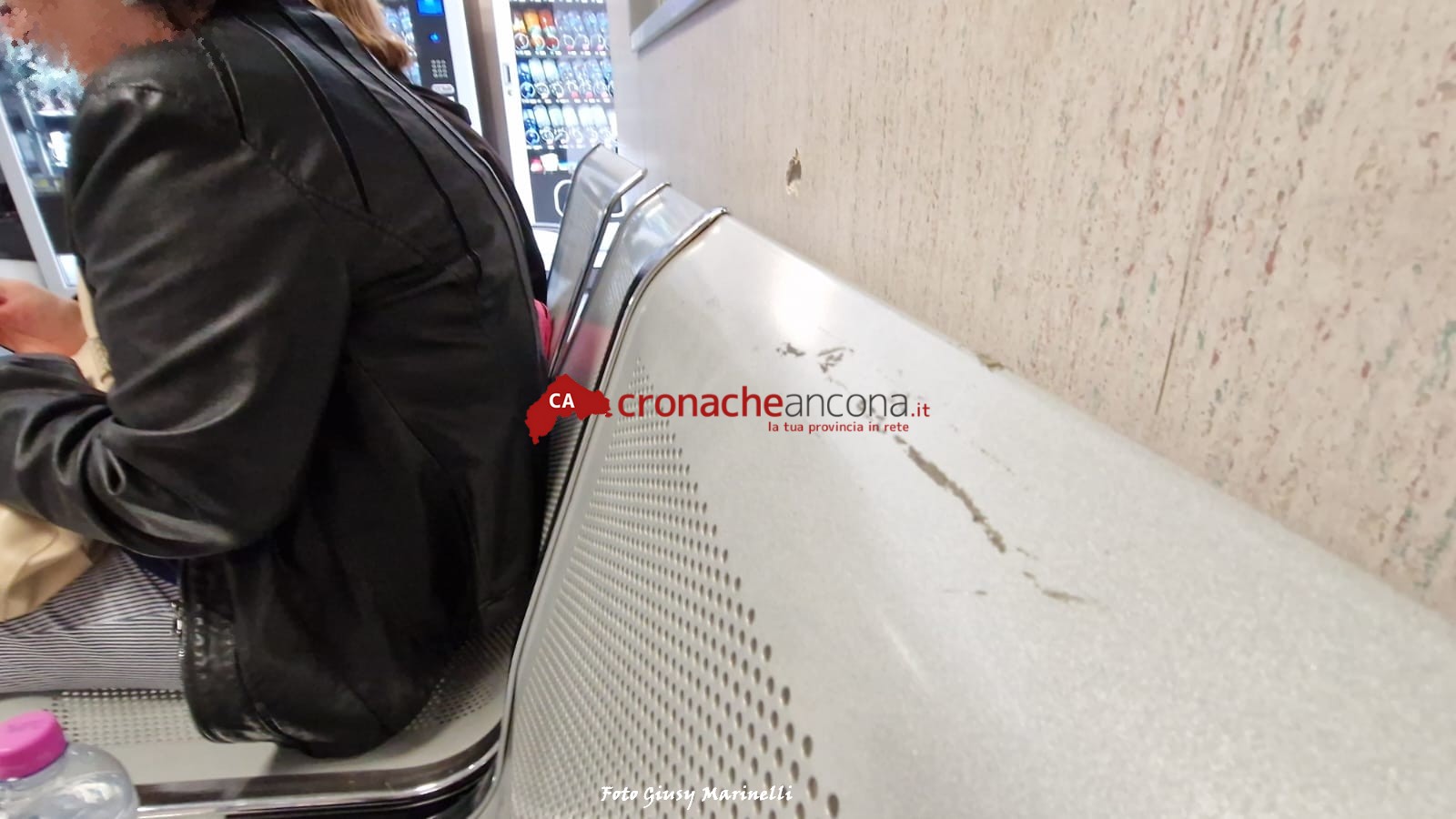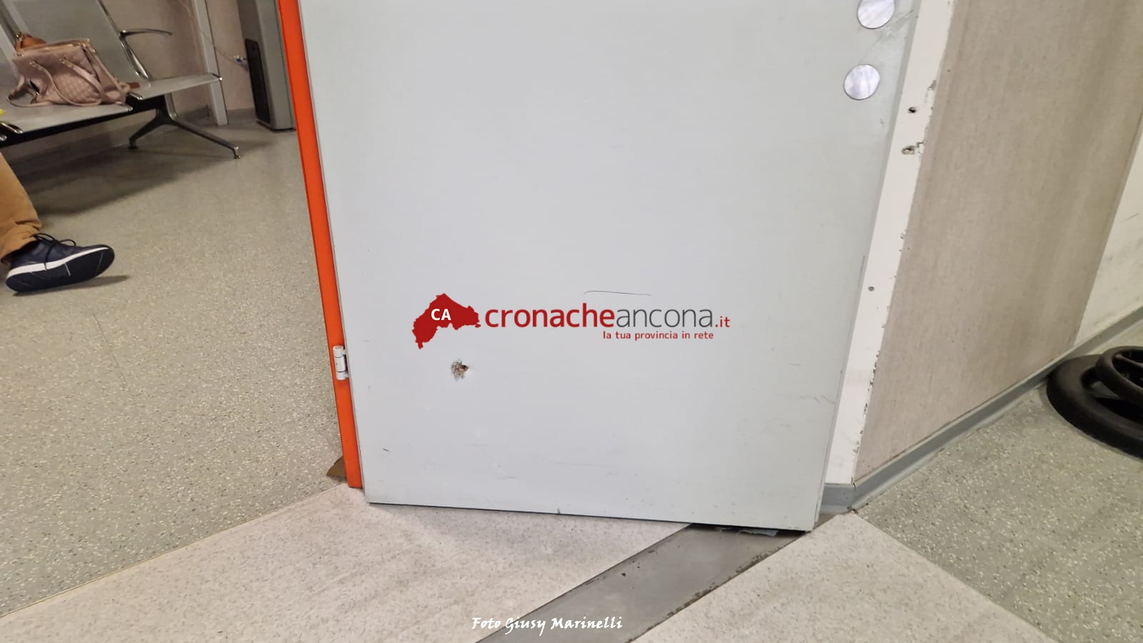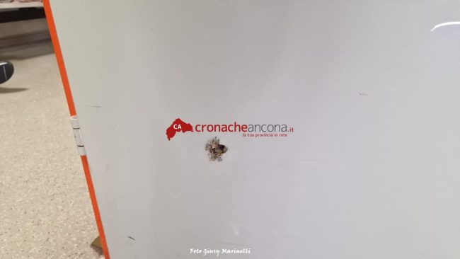Il proiettile esploso ha poi trapassato la parete in cartongesso del ‘gabbiotto’ di presidio, per attraversare quindi la sala d’aspetto con una traiettoria verso il basso, e conficcarsi nella porta tagliafuoco.