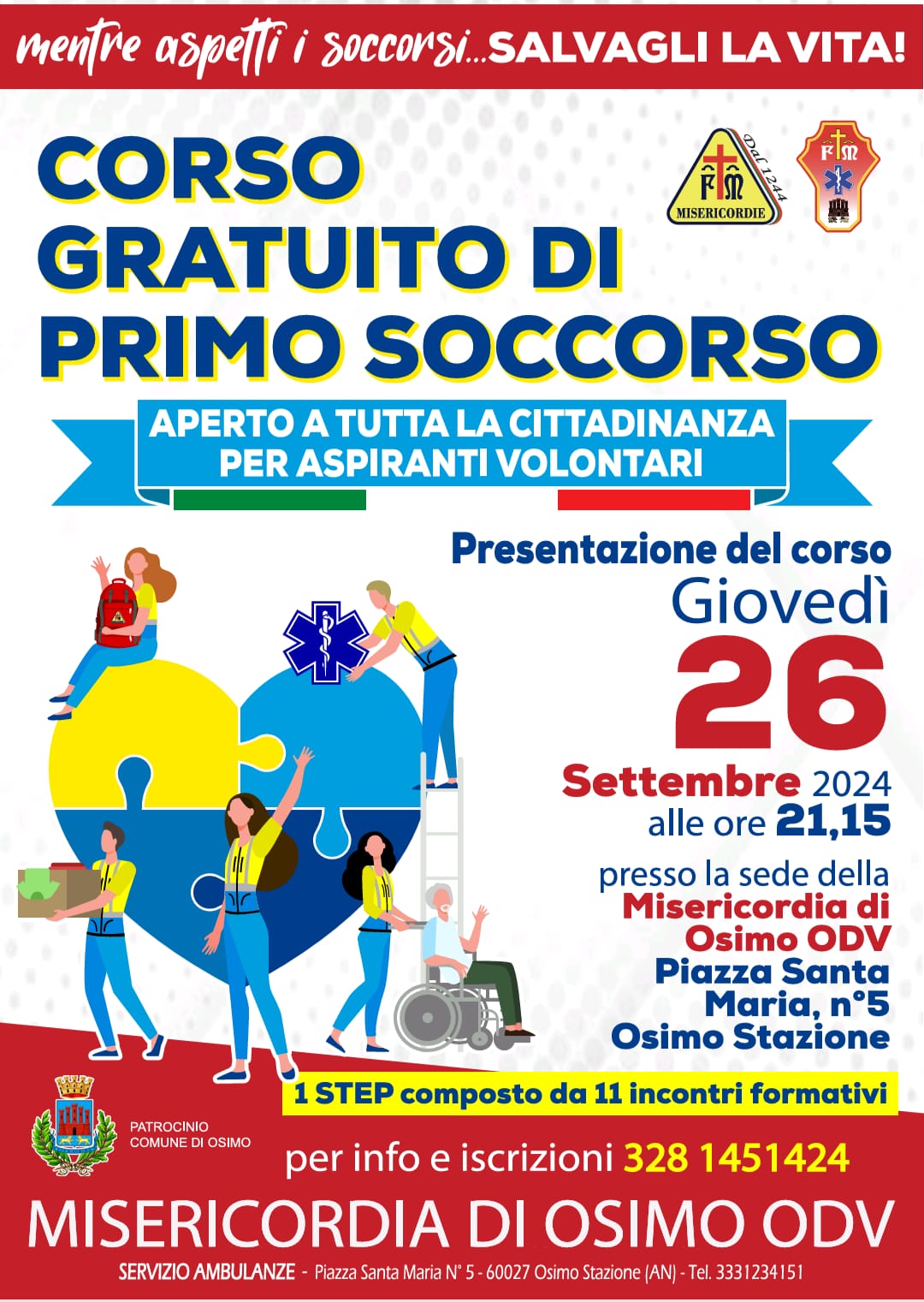 Sarà gratuito e andrà a formare i futuri volontari della Misericordia. Le lezioni, teoriche e pratiche (il primo step è composto da 11 incontri formativi), si svolgeranno presso la sede di Osimo Stazione in piazza Santa Maria, al civico 5, nel dopocena dalle ore 21 alle 23 in date che saranno comunicate domani, giovedì 26 settembre alle ore 21, nel corso del primo incontro. Relatori saranno medici e infermieri del 118 e formatori della Misericordia. Alla fine del corso verrà rilasciato un attestato di frequenza. «Con questo corso vogliamo essere sempre più numerosi in aiuto verso il prossimo. Vi aspettiamo numerosi domani sera, 26 settembre, alle ore 21» commenta il presidente della Misericordia Osimo, Claudio Gioacchini.