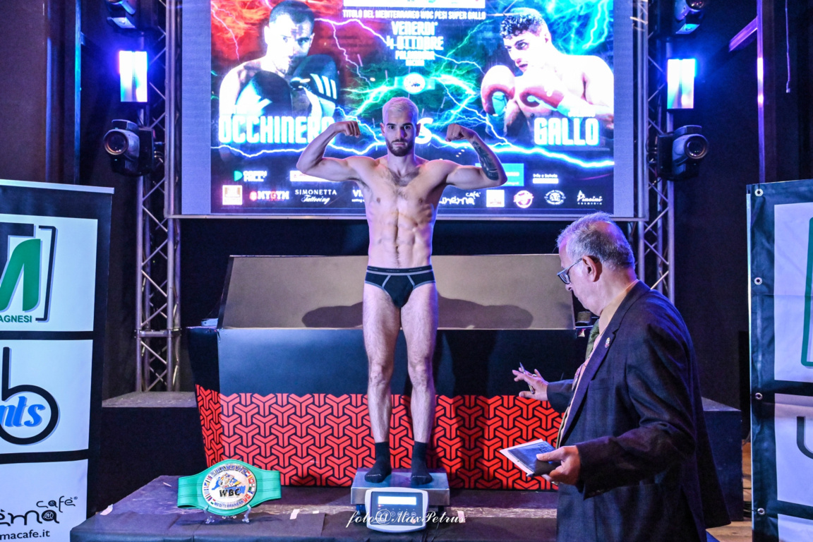Presso il “Club Nyx Ancona” di via I Maggio sono stati effettuate ieri le operazioni di peso del 28enne marchigiano Mattia Occhinero (10.02.01) ed il 32enne lombardo Iuliano Gallo (12.04.0) per il match valido al titolo vacante del Mediterrano Wbc dei pesi supergallo che si disputerà oggi 4 ottobre al Palacasali di Ancona. Il commissario di riunione ha certificato i pesi dei due pugili: Mattia Occhinero kg. 54,6 e Iuliano Gallo kg.55,3.