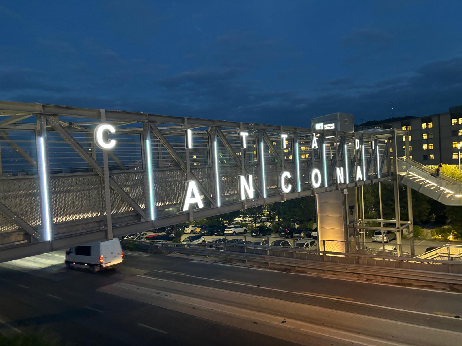 A poche ore dall’avvio dei lavori del G7 Salute alla Mole di Ancona, in previsione dell’ arrivo dei ministri del Forum, delle loro delegazioni e dei giornalisti delle testate dei Paesi interessati, verrà attivato attorno alle 18,30, oggi pomeriggio, alla presenza del sindaco Daniele Silvetti, l’’impianto di illuminazione “Città di Ancona” collocato sul sovrappasso pedonale su via Conca che collega il parcheggio di via Metauro e l’ospedale regionale Torrette di Ancona. «Ancona Servizi – sponsor tecnico dell’ opera- ha predisposto un’illuminazione architettonica e scenografica della struttura, collocata lungo una delle principali arterie di accesso alla città, e realizzato una scritta luminosa di benvenuto alla città di Ancona. Contestualmente è stato illuminato il percorso pedonale a completamento della struttura esistente, per rendere più fruibile e sicuro l’attraversamento degli utenti dell’ospedale regionale» ricorda una nota del comune di Ancona. Alla sommità della torre sono stati installati i loghi della Regione Marche e del Comune di Ancona.