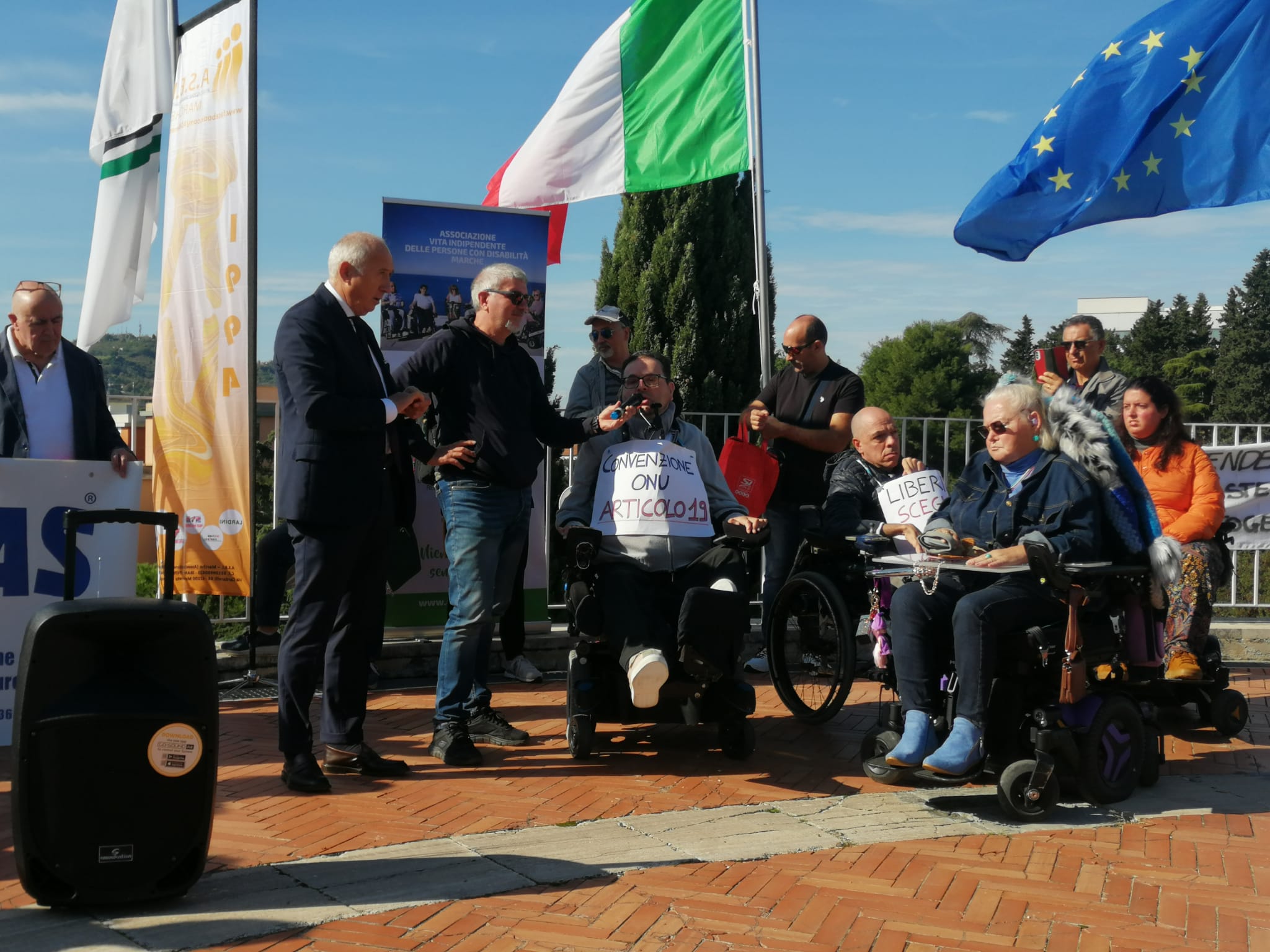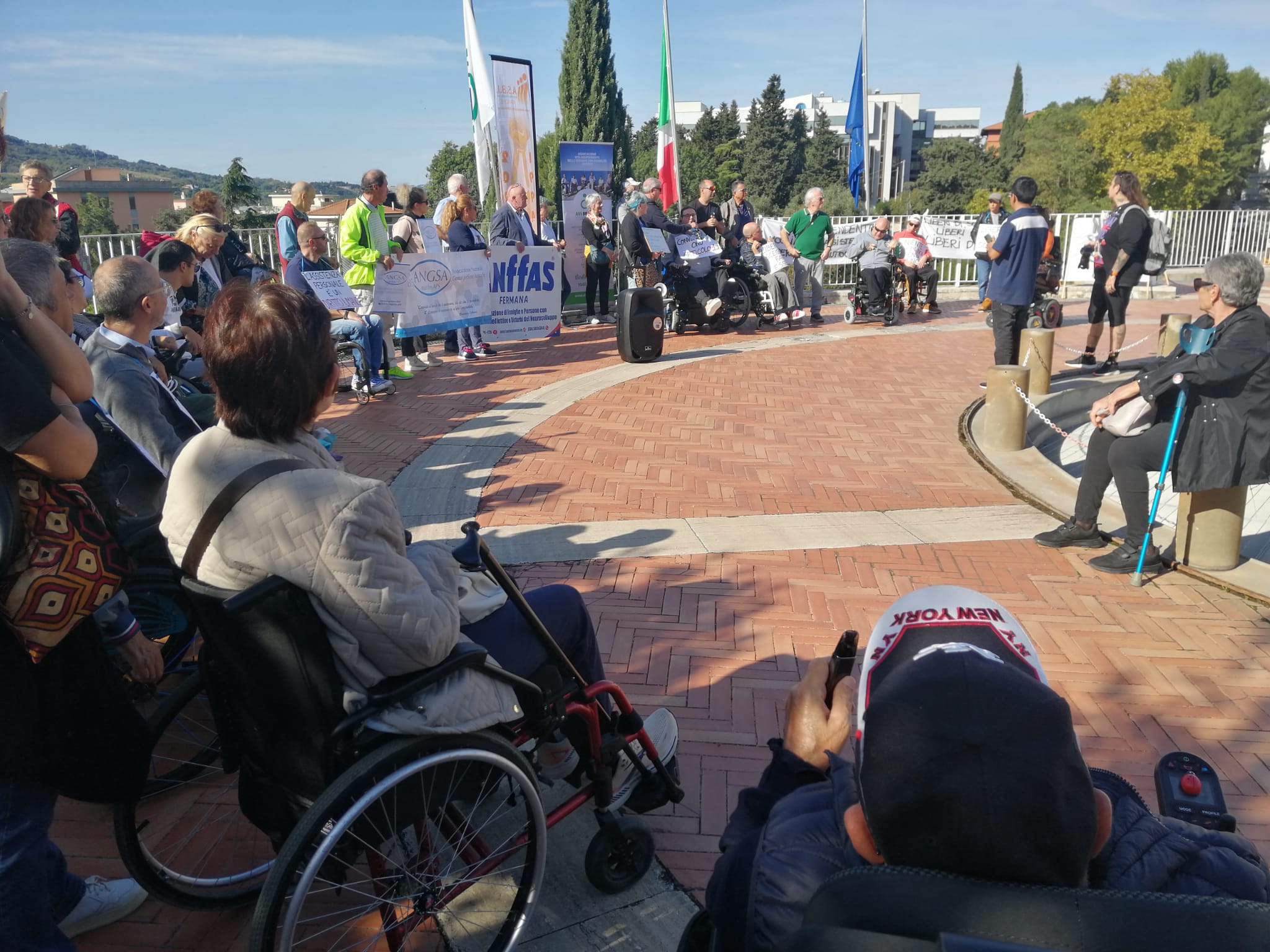 «Siamo venuti con quattro precise richieste: aumento dei budget per destinati all’assunzione degli assistenti personali, rivalutazione dei progetti vecchi di sei anni, scelta di una nuova scala dei bisogno delle persone con disabilità, riapertura del bando per fare entrare nel progetto 150 persone» – spiega Angelo Larocca, presidente di Avi Marche, associazione per la Vita indipendente delle persone con disabilità nelle Marche che ha dato il via al coordinamento di protesta. Durante l’incontro, è intervenuto nel piazzale anche l’ assessore alla Sanità Saltamartini, impegnato nel Consiglio della Regine Marche che si stava tenendo in contemporanea.