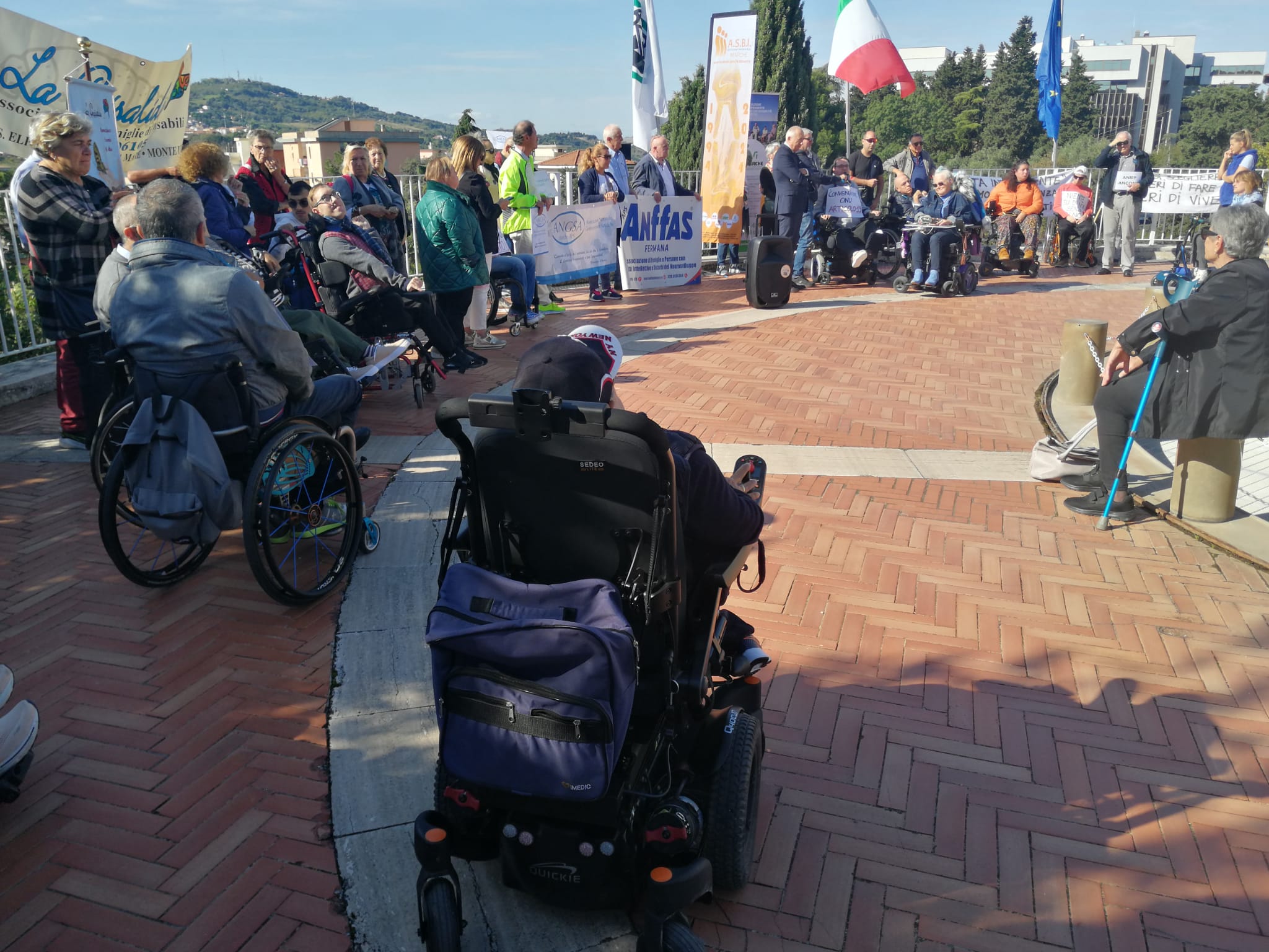 Uniti dallo slogan “Non vogliamo una vita di opportunità negate!” si è tenuta lunedì mattina, 14 ottobre, sul piazzale di palazzo Leopardi della Regione Marche, la manifestazione indetta dal coordinamento marchigiano “Insieme per la vita indipendente” con la partecipazione di più di cento persone. È la prima azione del coordinamento di protesta e di azione, formato da una rete di trentotto realtà, tra associazioni, comitati e singoli attivi per il diritto alla vita indipendente delle persone con disabilità. L’iniziativa nasce con il coordinamento di Avi Marche, aps che opera dal 2019 per promuovere, sostenere e attuare, a tutti i livelli, le iniziative necessarie per ottenere riconoscimento e esigibilità del diritto alla vita indipendente.
