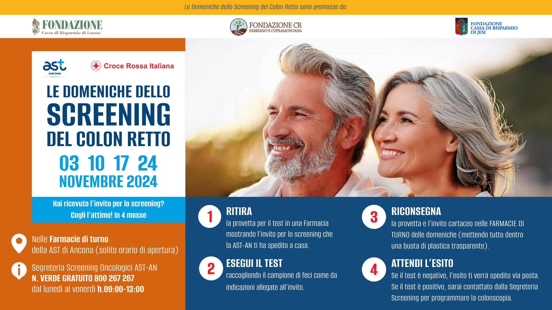 L’Ast Ancona in collaborazione con la Fondazione Cassa di Risparmio di Fabriano e Cupramontana, con la Fondazione Cassa di Risparmio di Jesi e con la Fondazione Cassa di Risparmio di Loreto, offre alla popolazione residente un’ulteriore quanto preziosa opportunità di aderire al Percorso Screening per la diagnosi precoce del tumore del colon retto nel corso delle quattro domeniche del mese di novembre.