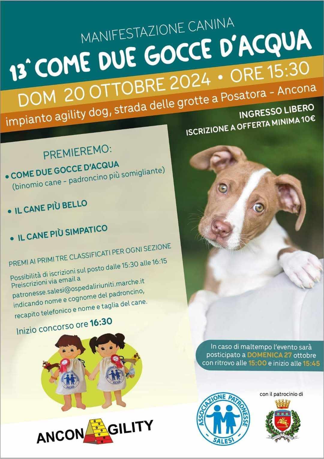 Ogni volta che si incrocia una coppia al… guinzaglio, la somiglianza tra cane e conduttore è sempre stata motivo di curiosità e di divertimento. Altrimenti non si spiegherebbe perché, ormai quasi una ventina di anni fa, la associazione Patronesse del Salesi, con una bella intuizione, si inventò un concorso intitolato “Come Due Gocce d’Acqua”. Così, dopo le undici edizioni di successo in Piazza Cavour e in Piazza Pertini, all’indomani della lunga pausa dovuta alla pandemia, l’evento si ripropone per il secondo anno consecutivo domani, domenica 20 ottobre, dalle ore 15.30 (inizio delle iscrizioni sul posto) nell’impianto Agility Dog, lungo Strada delle Grotte, a Posatora di Ancona. Ciò si deve al Patrocinio del Comune di Ancona e alla collaborazione con l’Anconagility gestore dell’impianto e con il Coni regionale delle Marche.
