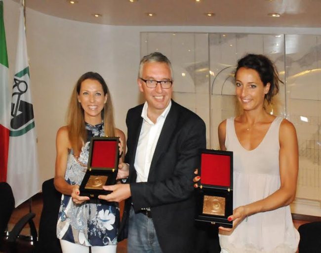 Da sin. Valentina Vezzali e Francesca Di Francisca premiate nel 2015 in Regione dall’allora governatore Ceriscioli (archivio)