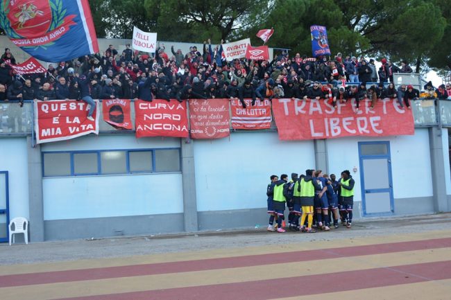 I giocatori dell’Ancona esultano dopo il vantaggio di fronte ai loro tifosi, espugnata la tana del Notaresco