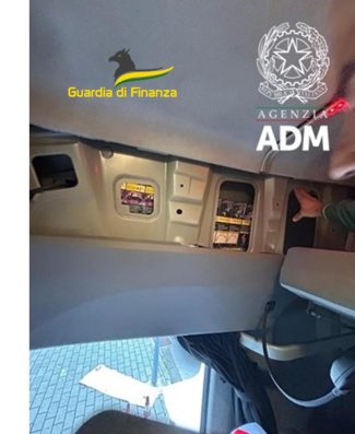 E’ stato quindi vanificato il tentativo di sottrarre ai controlli le sigarette, che erano state nascoste nell’imbottitura dei sedili, all’interno di varie intercapedini appositamente realizzate nella motrice e nei vani dei portelloni anteriori del mezzo, oltre che in cavità ricavate ad hoc nella parte posteriore dell’abitacolo del conducente.