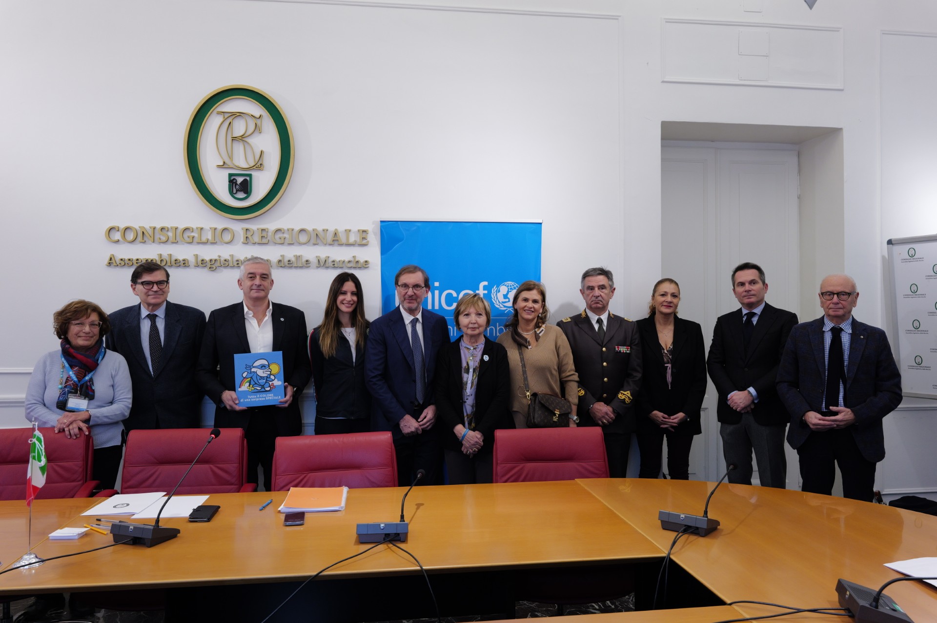 Da sinistra: Paola Guidi, Presidente del Comitato Provinciale UNICEF di Ancona, Dino Latini, Presidente del Consiglio Regionale delle Marche, Paolo Rozera, Direttore generale dell’UNICEF Italia, Claudia Mancinelli allenatrice delle olimpioniche individualiste italiane Sofia Raffaeli e Milena Baldassarri e della società ginnastica Fabriano, Pierpaolo Clementoni, Direttore Ricerca Avanzata Clementoni, Mirella Mazzarini, Presidente del Comitato regionale UNICEF Marche, Michela Francoletti, Direzione Medica dell’Ospedale Salesi, Pierpaolo Patrizietti, Comandante dei Vigili del fuoco di Ancona, Manuela Caucci, Assessore ai Servizi Sociali di Ancona, Simone Pizzi, Presidente del Consiglio Comunale di Ancona, il giornalista Giovanni Filosa