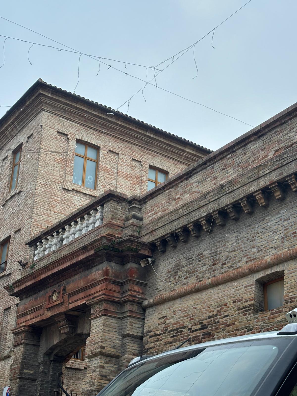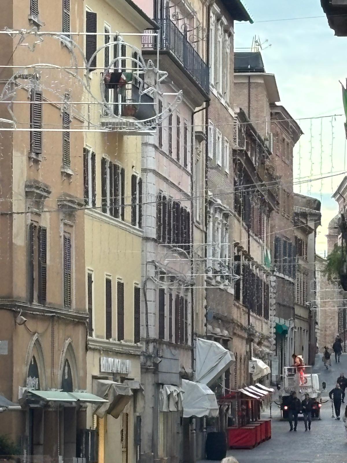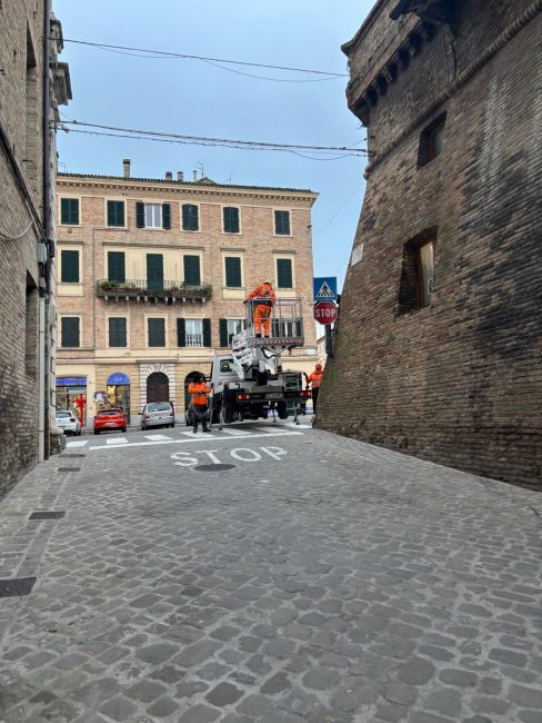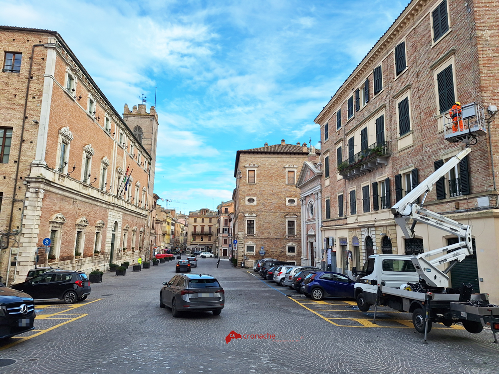 Il Palazzo comunale di Osimo avvolto dall’atmosfera natalizia, con gli operai oggi impegnati a montare le luminarie sul Corso e sulle piazze centrali sotto il coordinamento di Osimo Servizi