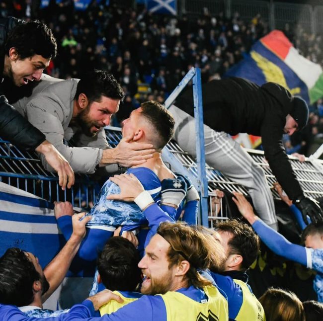 Dopo una partita sofferta nel primo tempo, ma dominata nella ripresa, l’attaccante protagonista della scalata lariana dalla Serie D devia in rete l’assist di Cutrone anticipando tutti sul primo palo con la punta del piede, poi regalando a Nico Paz il pallone solo da spingere in rete per il raddoppio.