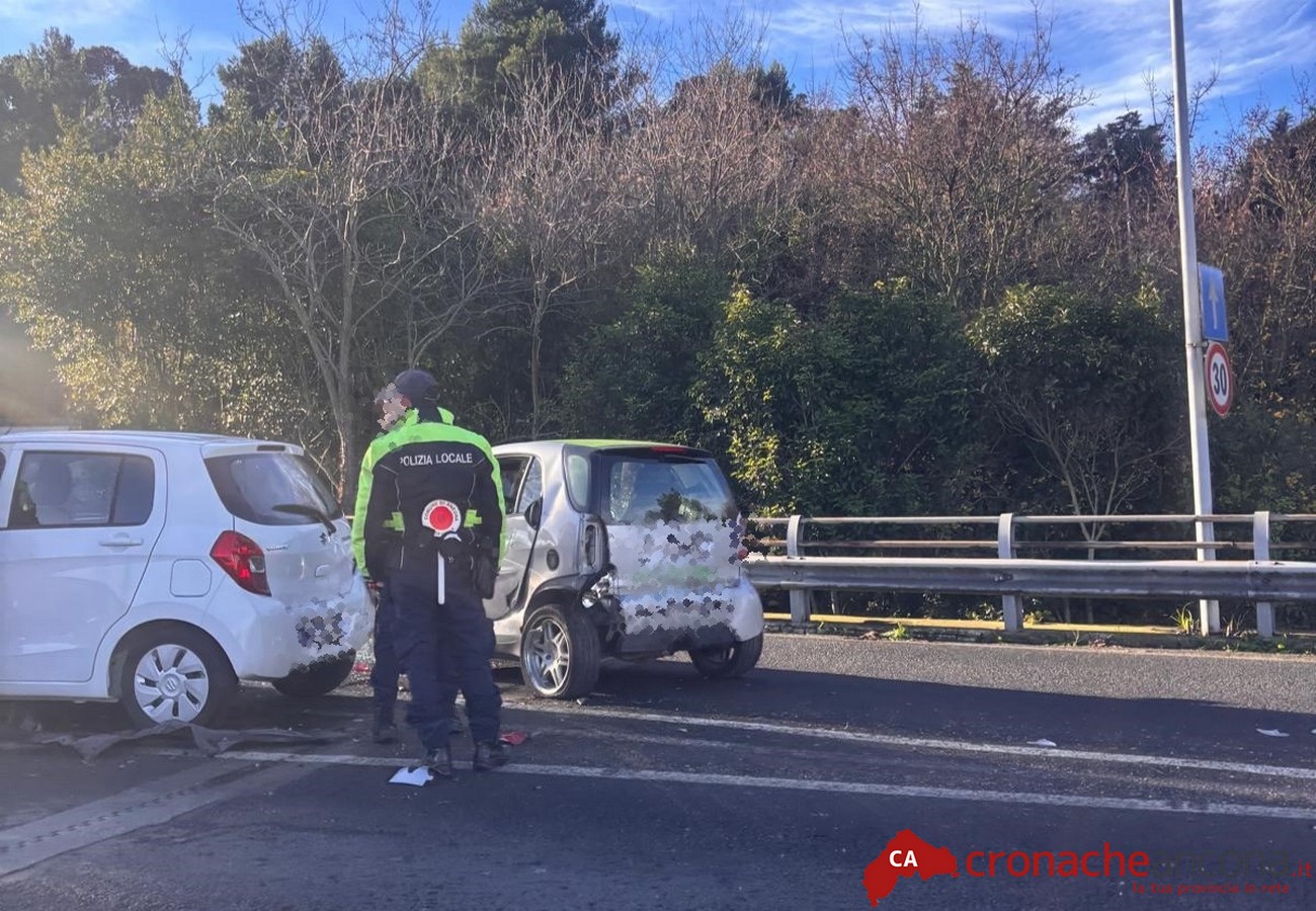 Per cause in corso di accertamento da parte della polizia locale, giunta sul posto insieme ai vigili del fuoco, due auto si sono scontrate in prossimità del bivio e una è finita contro la cuspide del guardrail.