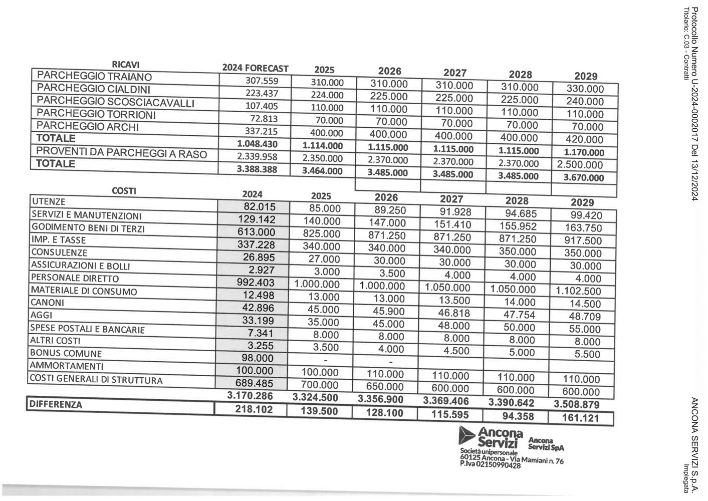 Le proiezioni degli introiti e costi stimati nella gestione parcheggi di Ancona Servizi per i primi 5 anni dei 20 di durata del nuovo contratto (clicca sull’immagine per ingrandirla)