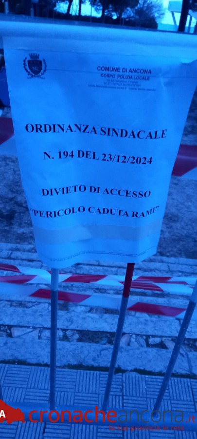 Nel primo pomeriggio di oggi, il Comune ha reso noto che «In considerazione della situazione di rischio generalizzato dovuto agli eventi dei giorni scorsi, conclamati dalle Allerte meteo della Protezione civile del 22 e del 23 dicembre relative a fenomeni ventosi con raffiche tali da raggiungere il grado di “burrasca forte” (76-87 km/h), il sindaco Daniele Silvetti firma una nuova ordinanza per la chiusura, nelle giornata del 25-26 e 27 dicembre dei parchi pubblici, con divieto di accesso a quelli non perimetrati, nonché ai cimiteri, fatta salva la possibilità, in caso di necessità, di trasportare feretri o urne cinerarie nonché di effettuare le operazioni cimiteriali già programmate nel Cimitero di Tavernelle da parte del personale di Ancona Servizi».