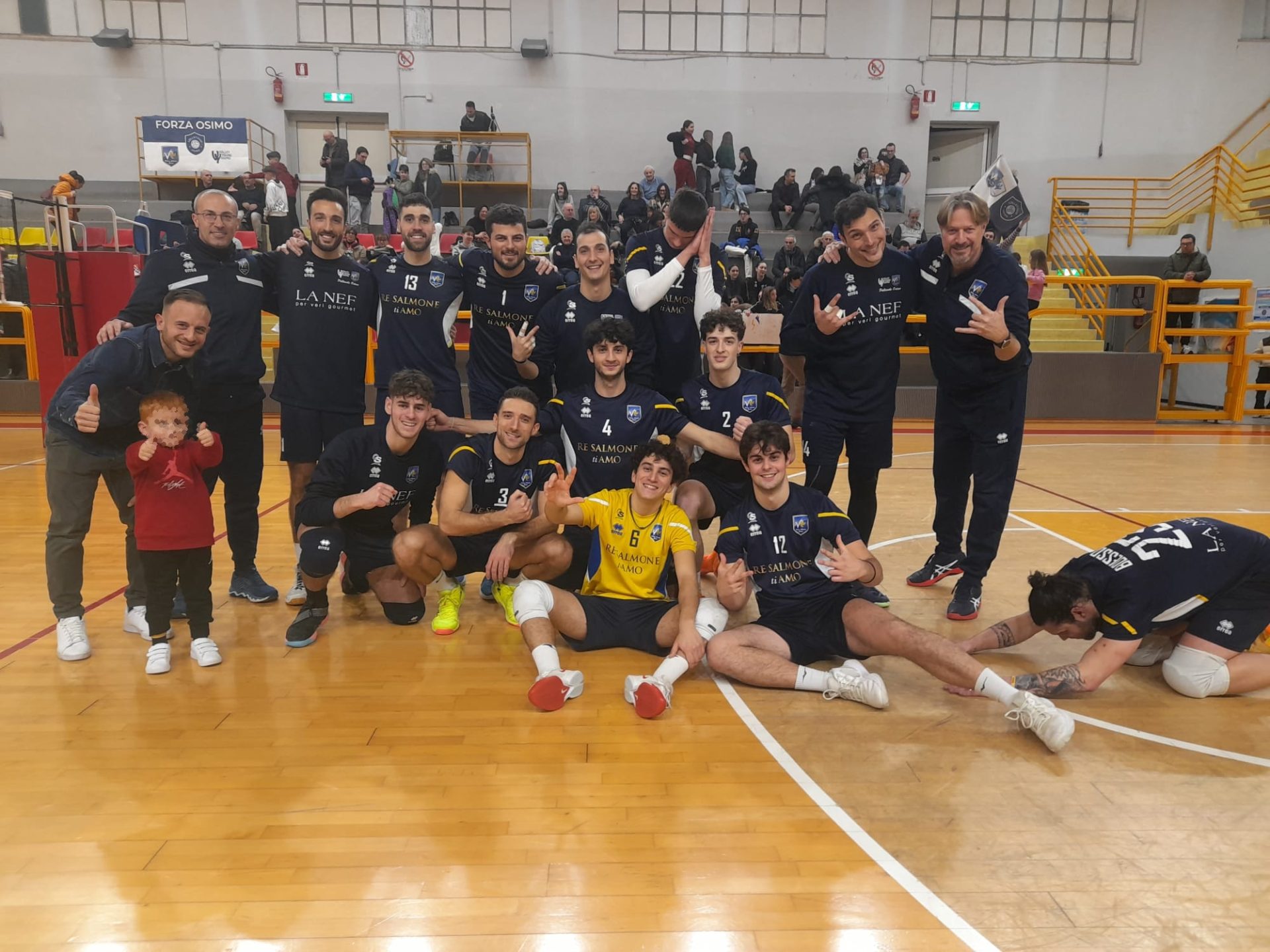 Carotti a muro, qualche errore per la squadra di Di Felice e i biancoblu aprono il terzo set con un parziale di 5-0. Il Montorio Volley si difende a muro con Di Felice e Ricci ma è un caloroso pubblico del Pala Bellini a trascinare i ragazzi osimani grazie ad una grande prova di squadra, 19-10. Coach Pascucci inserisce i giovani Melonari e Colaluca: il match ball per La Nef Re Salmone arriva con Melonari che conquista l’ultimo punto sul 25-15.