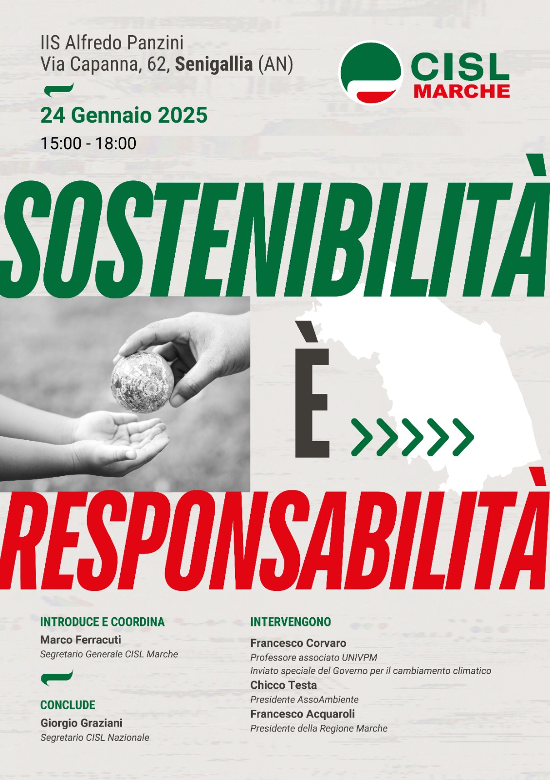 Seminario “Sostenibilità è Responsabilità”, promosso e organizzato da Cisl Marche, a Senigallia, domani a partire dalle ore 15 presso l’IIS Alfredo Panzini, in via Capanna 62.