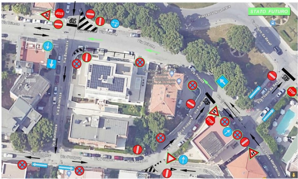 • Obbligo di svolta a destra all’intersezione con Via Bainsizza per i veicoli provenienti da Piazza Diaz in direzione Via Bainsizza – Via Podgora o di proseguire diritto verso Via Podgora;