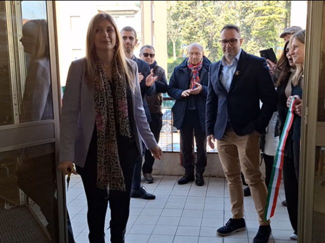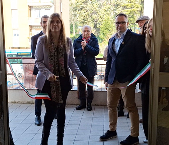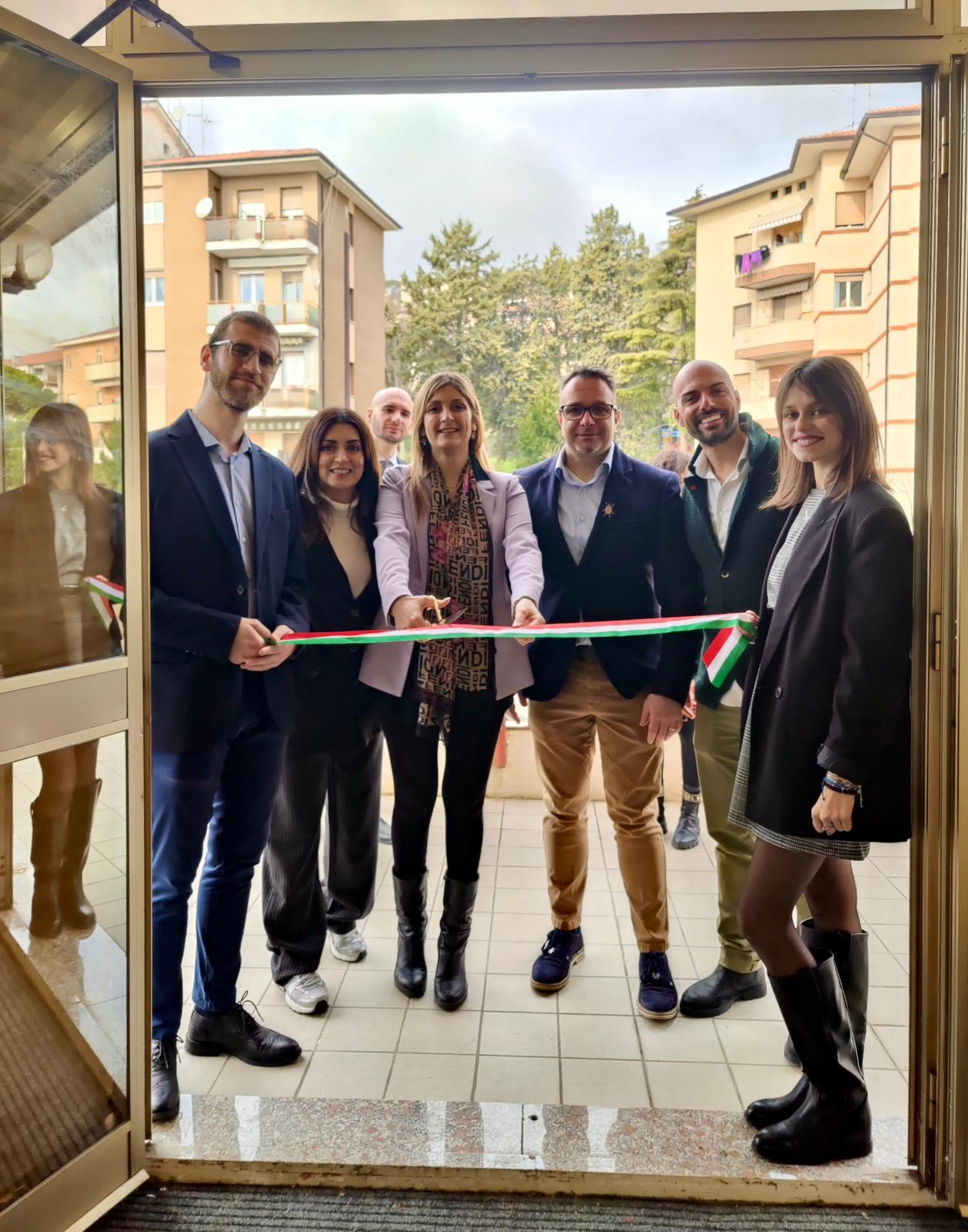 Giulia Dionisi taglia il nastro della sede di Rinasci Osimo, nel quartiere della Sacra Famiglia, «uno tra quelli dove si è registrato un tasso percentuale più alto di astensione al voto alle Comunali 2024» ha spiegato