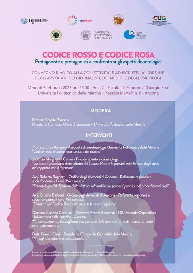 Di questi aspetti se ne parlerà venerdì alle ore 15 ad Ancona nell’aula C della Facoltà di Economia nel convegno moderato dalla professoressa Ornella Pisacane presidente del Comitato unico di Garanzia dell’Università Politecnica delle Marche in cui interverranno la professoressa Erica Adrario associata di anestesiologia dell’Università Politecnica delle Marche che illustrerà le ragioni che hanno portato all’introduzione del Codice Rosso e del Codice Rosa, l’avv. Cristina Barboni del Foro di Ancona che indicherà alcuni degli strumenti di prevenzione previsti dal Codice Rosso, la dottoressa Susanna Contucci direttore del pronto soccorso dell’Azienda Ospedaliero Universitaria delle Marche, che spiegherà il Codice Rosa del Pronto soccorso, la dottoressa Margherita Carlini, psicoterapeuta e criminologa, che affronterà gli aspetti psicologici della vittima di violenza di genere e/o di violenza domestica, l’avv. Roberta Ragnetti del Foro di Ancona che si occuperà degli aspetti deontologici dell’Avvocato difensore della vittima vulnerabile e Franco Elisei, presidente dell’Ordine dei giornalisti delle Marche, per gli aspetti inerenti la comunicazione dei media.
