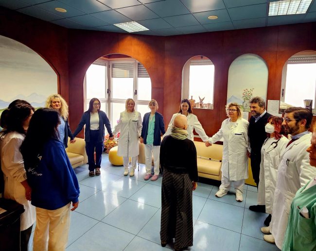 Oggi, 4 febbraio, ricorre il “World cancer day”, la giornata mondiale contro il cancro. Nell’occasione, questa mattina, la Uoc di Oncologia di Fabriano, diretta da Rosa Rita Silva, ha organizzato un momento di rilfessione sul tema della campagna 2025 – 2027: “United By Unique” ovvero “Uniti dall’essere unici”. La dottoressa Rosa Rita Silva, i medici, gli infermieri e il personale del reparto insieme al direttore generale della Ast Ancona, Giovanni Stroppa, hanno realizzato una foto con al centro una paziente, a simboleggiare il tema della campagna: mettere le persone al centro della cura e le “loro storie” al centro della conversazione. «Per unicità – ha spiegato la dottoressa Silva – si intende l’unicità delle storie di vita degli operatori e dei pazienti, dei vissuti e della narrazione del nostro lavoro, dei vissuti e della narrazione della malattia dei nostri pazienti e dei loro familiari. Si tratta di unicità che convergono in un caleidoscopio di differenze che rendono uniti nel vivere, pensare, sentire e gestire quotidianamente il lungo e impegnativo percorso che accomuna noi operatori e i nostri pazienti».