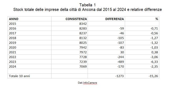 Il quadro economico di Ancona continua a mostrare segnali preoccupanti. L’analisi dei dati sullo stock di imprese, elaborata dalla Cn di Ancona su dati InfoCamere, conferma una tendenza negativa che prosegue da oltre un decennio. Dal 2015 a oggi, il capoluogo marchigiano ha visto scomparire 1.273 imprese, passando dalle 8.342 unità del 2015 alle attuali 7.069. Solo nell’ultimo anno, il saldo negativo è stato di 170 aziende, pari a un -2,35% rispetto al 2023.