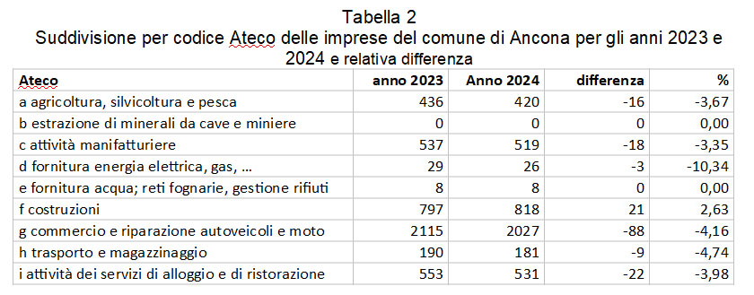 «L’analisi dei settori economici evidenzia difficoltà nei comparti tradizionalmente in sofferenza, come l’agricoltura (-3,67%) e il commercio alimentare e non alimentare (-4,16%). La vera sorpresa – sottolinea una nota di Cna Ancona – del 2024, però, è rappresentata dalla contrazione di attività che fino a pochi anni fa trainavano l’economia locale. Particolarmente colpiti risultano i servizi di ristorazione (-3,98%), le attività professionali e tecniche (-4,20%) e il comparto socio-sanitario (-7,25%). Se il ridimensionamento del settore sanitario può essere ricondotto alla fine dell’emergenza Covid, meno prevedibile è la contrazione di comparti come la ristorazione e i servizi professionali, che finora avevano rappresentato elementi di crescita per un’area urbana come Ancona. L’unico settore in controtendenza è l’edilizia, che registra un incremento del 2,63%, trainato dagli incentivi del Superbonus 110% e dagli investimenti del Recovery Fund nelle opere pubbliche».