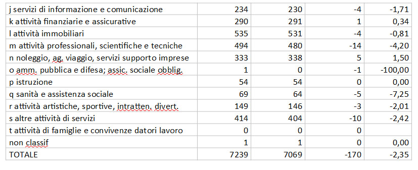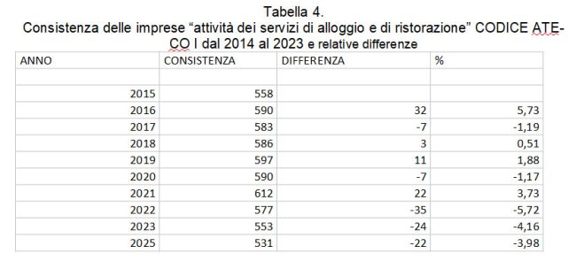 Il comparto turistico e della ristorazione, che in passato aveva compensato le perdite di altri settori, ha subito un brusco rallentamento a partire dal 2022. La crisi pandemica sembra aver lasciato segni profondi, con un calo continuo negli ultimi anni. Nel 2023, il codice Ateco I (servizi di alloggio e ristorazione) ha perso 22 attività (-3,98%), e il dato più preoccupante riguarda la performance dell’ultimo decennio: per la prima volta, il saldo a dieci anni è negativo, con una perdita di 27 imprese (-4,84%). Un indicatore che certifica l’ingresso della ristorazione in una fase di contrazione strutturale.