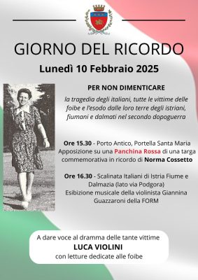 Nel pomeriggio, ore 15,30, al Porto antico, nei pressi della Portella Santa Maria, a cura dell’ assessorato alle Pari Opportunità, verrà scoperta una targa affissa sulla già esistente panchina rossa, in memoria di Norma Cossetto, studentessa istriana, catturata e imprigionata, violentata, seviziata e infine gettata in una foiba. A dare voce al dramma delle tante vittime delle rappresaglie di quel periodo, il noto attore e doppiatore marchigiano, direttore di scuole di doppiaggio, Luca Violini.