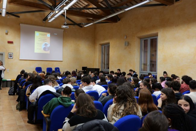 L’aula magna del Liceo classico di Jesi, in cui si è svolto l’incontro, con tutti gli studenti partecipanti