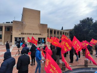 Il presidio dei lavoratori Imr. ex Caterpillar di Jesi davanti alla Regione Marche (foto Fb Fiom Ancona)