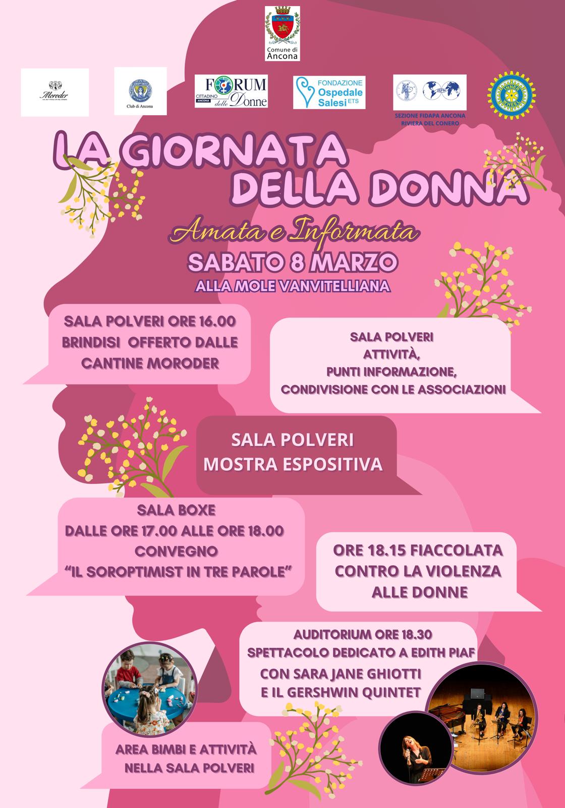 Alla conferenza stampa di presentazione della Giornata dell’ 8 marzo hanno partecipato referenti della Fondazione ospedale Salesi e delle Associazione Patronesse, impegnate a vario titolo nell’assistenza e in svariati progetti con al centro i bambini ma anche donne e mamme, in un contesto sociale che vede profonde trasformazioni; dell’ Inner Wheel Ancona con le sue volontarie impegnate nel territorio da 30 anni per promuovere una crescita sociale e relazionale; di Fidapa -Federazione Donne Arti Professioni Affari- che illustrerà attraverso un gioco da tavolo la Carta dei Diritti dei Bambini e delle Bambine, alla quale anche il Comune di Ancona aderisce e che è stata recepita in ambito scolastico come strumento educativo; dell’ Unicef -Fondo Nazioni Unite per l’Infanzia che sarà presente con più postazioni e laboratori; di Free Woman che tutela le vittime e si batte contro il fenomeno della tratta; del Movimento per la Vita che segue un centinaio di coppie e famiglie, avvicinandosi alle donne in difficoltà; del Centro Psicosintesi che da 35 anni ad Ancona si occupa di formazione dell’ inidividuo, del maschile (e femminile) sano, di cultura della psicologia e della spiritualità.