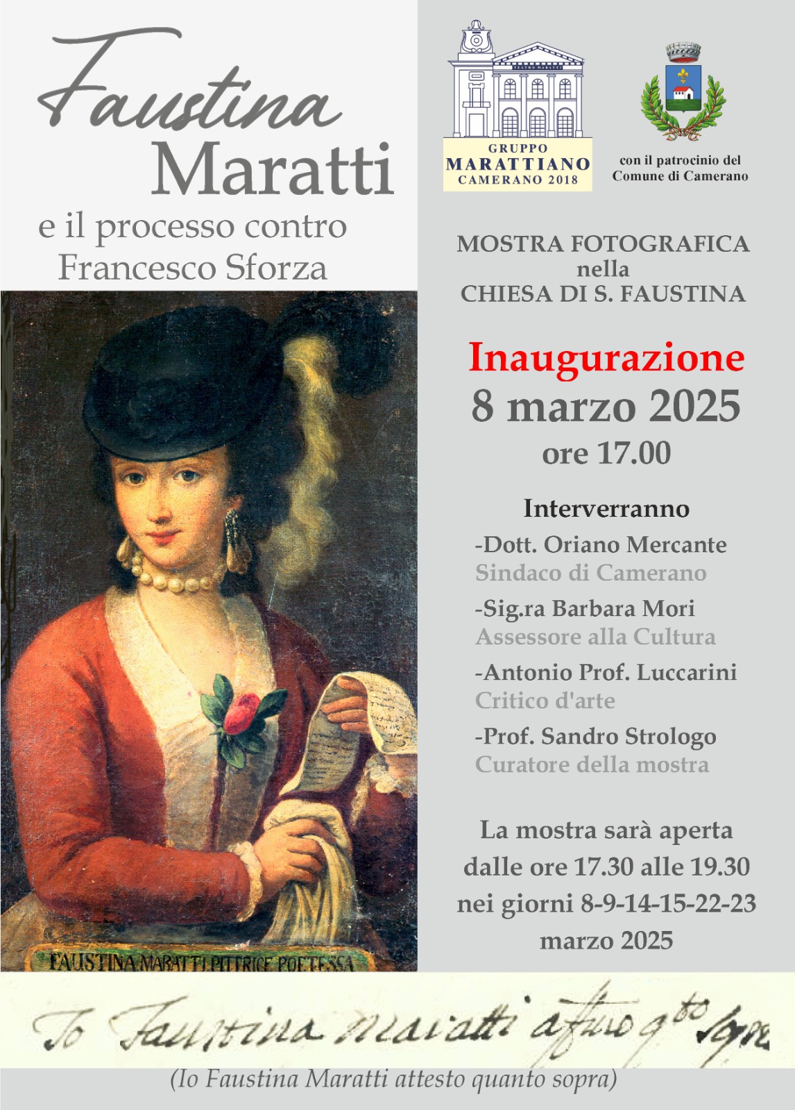 Le celebrazioni dell’8 marzo si aprono sabato alle ore 17 con l’inaugurazione della mostra fotografica Faustina Maratti e il processo contro Francesco Sforza, presso la Chiesa di Santa Faustina a Camerano.