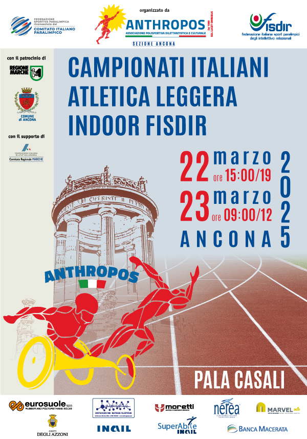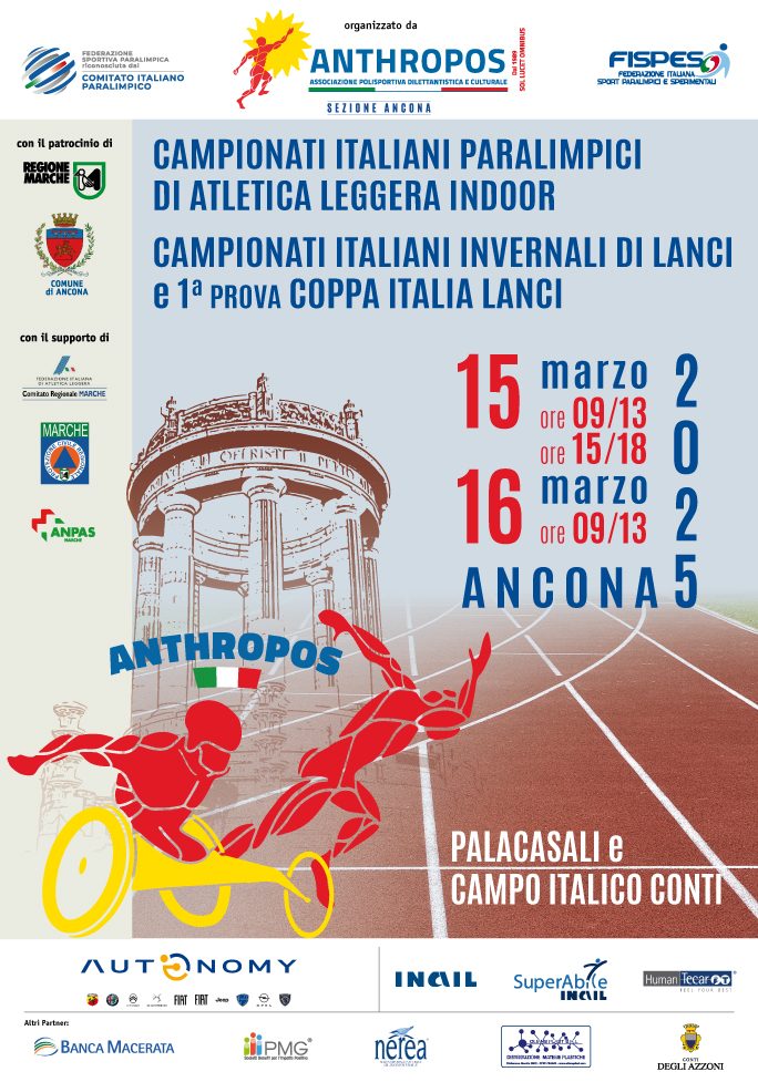 Si terrà al Palacasali di Ancona la 20esima edizione dei Campionati Italiani Paralimpici di Atletica Indoor Fispes (Federazione Italiana Sport Paralimpici e Sperimentali) e dei Campionati Invernali di Lanci Fispes, organizzata dall’Anthropos.