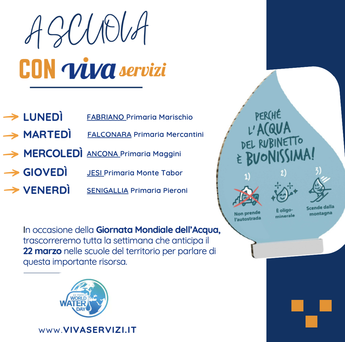 Per rafforzare l’attività di sensibilizzazione nelle scuole primarie e secondarie di primo e secondo grado che svolge abitualmente con il progetto DidatticaViva, Viva Servizi che gestisce il servizio idrico integrato in 43 comuni, da sempre molto attenta alla sensibilizzazione dei più giovani ai temi della tutela della risorsa idrica e del non spreco, ha previsto da lunedì 17 a venerdì 21 un incontro in una scuola sempre diversa del territorio servito per illustrare le buone pratiche di tutela dell’acqua coerentemente con il progetto di Ata Rifiuti “L’acqua non va per l’insù” di cui Viva Servizi è partner. Si parte lunedì 17 marzo nella scuola primaria di Marischio per proseguire poi martedì alla scuola primaria “Mercantini” di Falconara M., mercoledì ad Ancona nella primaria “Maggini”, giovedì a Jesi nella primaria “Monte Tabor” e venerdì a Senigallia nella primaria “Pieroni”.