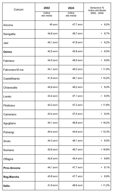 Tab.2 Indice Età media 2002 – 2024 e raffronto. Dati di alcuni Comuni della provincia raffrontati con il dato Provinciale di Ancona, Regione Marche e Italia