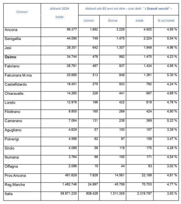 La provincia di Ancona ha un’età media in linea con quella regionale di 47,7. Comuni come Senigallia, Fabriano, Falconara, Numana si distinguono per  l’età media molto alta,  mentre tra i comuni più giovani della provincia di Ancona si collocano: Polverigi 44,6; Offagna 45,4; Osimo 45,9 e Castelfidardo 46,00. Anche la quota della popolazione marchigiana con oltre 75 anni è destinata a crescere. Attualmente, dati 2024, è di  131.615 mila unità ( 39% rappresentato da uomini e 61% dalle donne)  nelle proiezioni Istat passerà ad  oltre 155mila unità (+18,2%). Immaginate una popolazione di 75enni corrispondente all’attuale, complessiva popolazione dei comuni di Ancona, Osimo e Castelfidardo. Un dato demografico che deve far riflettere che liberato dalle percentuali segnala che nella Regione e a livello provinciale siamo ad un passo dal traguardo, non invidiabile, che un residente su dieci ha più di 75 anni.