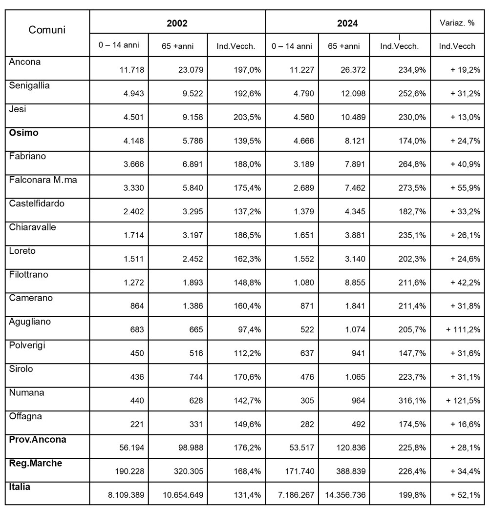 Per comprendere meglio la questione ho estrapolato i dati demografici dei principali comuni della nostra provincia mettendo a confronto i dati del 2002 e quelli ricavati dalle tabelle Istat 2024. L’attuale indice di vecchiaia (è il rapporto percentuale tra il numero degli ultrasessantacinquenni ed il numero dei giovani fino a 14 anni) dell’Italia è 199,8%. L’indice di invecchiamento della Regione Marche è pari 226,4%( nel 2002 era di 168,4)  vale a dire ci sono 226,4 anziani ogni 100 giovani. Il grado di invecchiamento della Provincia di Ancona è pari a 225,8 ( era di 176,2 vent’anni fa). Meglio della provincia di Ancona registrano i dati di Pesaro Urbino 214,7 e Macerata 224,3. Solo 4 comuni ( con maggiore popolazione e limitrofi alla nostra area della Vallesina) della provincia hanno un valore inferiore al valore nazionale, vale a dire: Osimo, Castelfidardo, Polverigi e Offagna. Preoccupante, comunque,  la generalizzata tendenza all’invecchiamento della popolazione della provincia di Ancona che è del 225,8% mentre la Regione Marche è al 226,4%. Raffrontando questo valore su  alcuni comuni, Osimo  ha il grado di invecchiamento a 174,0 il comune di  Castelfidardo ha l’indice di vecchiaia a 182,6 che dice che ci sono 182,6 anziani ogni 100 giovani. Senigallia ha un valore di 252,6 altissimo superiore al dato regionale e di gran lunga anche di quello nazionale che è 199,8. Interessante il dato di due comuni vicini e accomunati da diversi servizi ma con indici demografici di vecchiaia estremamente diversificati: Polverigi ha un indice di 147,7 mente Agugliano è al 205,7.