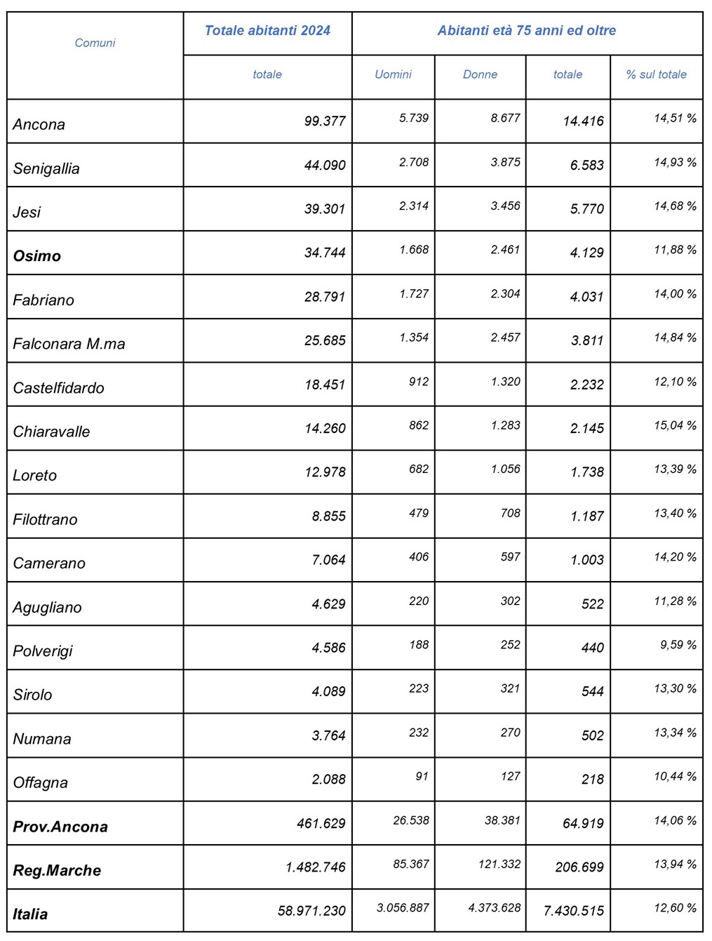 La provincia di Ancona ha un’età media in linea con quella regionale di 47,7. Comuni come Senigallia, Fabriano, Falconara, Numana si distinguono per  l’età media molto alta,  mentre tra i comuni più giovani della provincia di Ancona si collocano: Polverigi 44,6; Offagna 45,4; Osimo 45,9 e Castelfidardo 46,00. Anche la quota della popolazione marchigiana con oltre 75 anni è destinata a crescere. Attualmente, dati 2024, è di  131.615 mila unità ( 39% rappresentato da uomini e 61% dalle donne)  nelle proiezioni Istat passerà ad  oltre 155mila unità (+18,2%). Immaginate una popolazione di 75enni corrispondente all’attuale, complessiva popolazione dei comuni di Ancona, Osimo e Castelfidardo. Un dato demografico che deve far riflettere che liberato dalle percentuali segnala che nella Regione e a livello provinciale siamo ad un passo dal traguardo, non invidiabile, che un residente su dieci ha più di 75 anni.