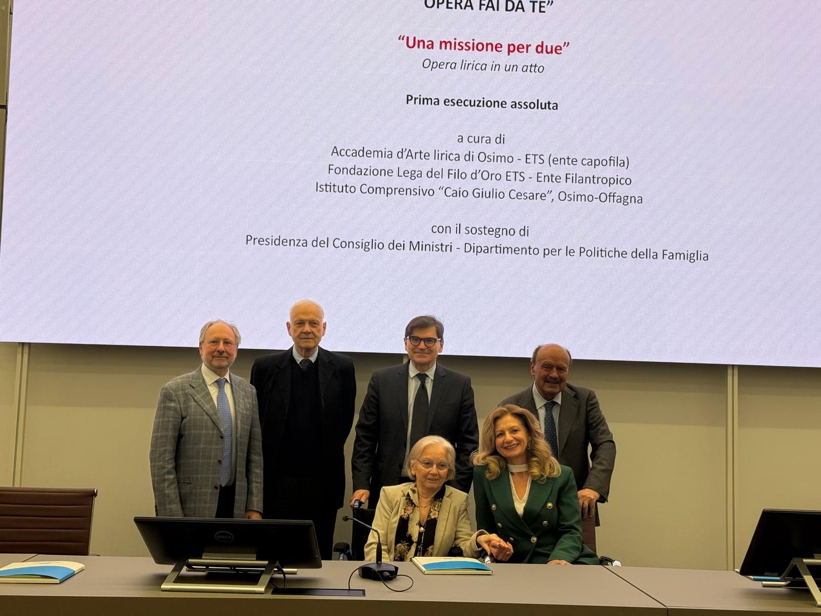 Un momento della conferenza stampa di presentazione stamattina alla Lega del Filo d’Oro. Nella foto Dino Latini presidente del Consiglio regionale delle Marche, Rossano Bartoli presidente della Lega del Filo d’Oro, Patrizia Ceccarani segretario Comitato tecnico scientifico ed etico Fondazione Lega del Filo d’Oro Ets, Pietro Alessandrini presidente Accademia d’Arte Lirica di Osimo, Lorella Belleggia dirigente dell’Istituto Comprensivo “Caio Giulio Cesare” di Osimo-Offagna e Vincenzo De Vivo direttore artistico dell’Accademia d’Arte Lirica e librettista opera “Una missione per due”
