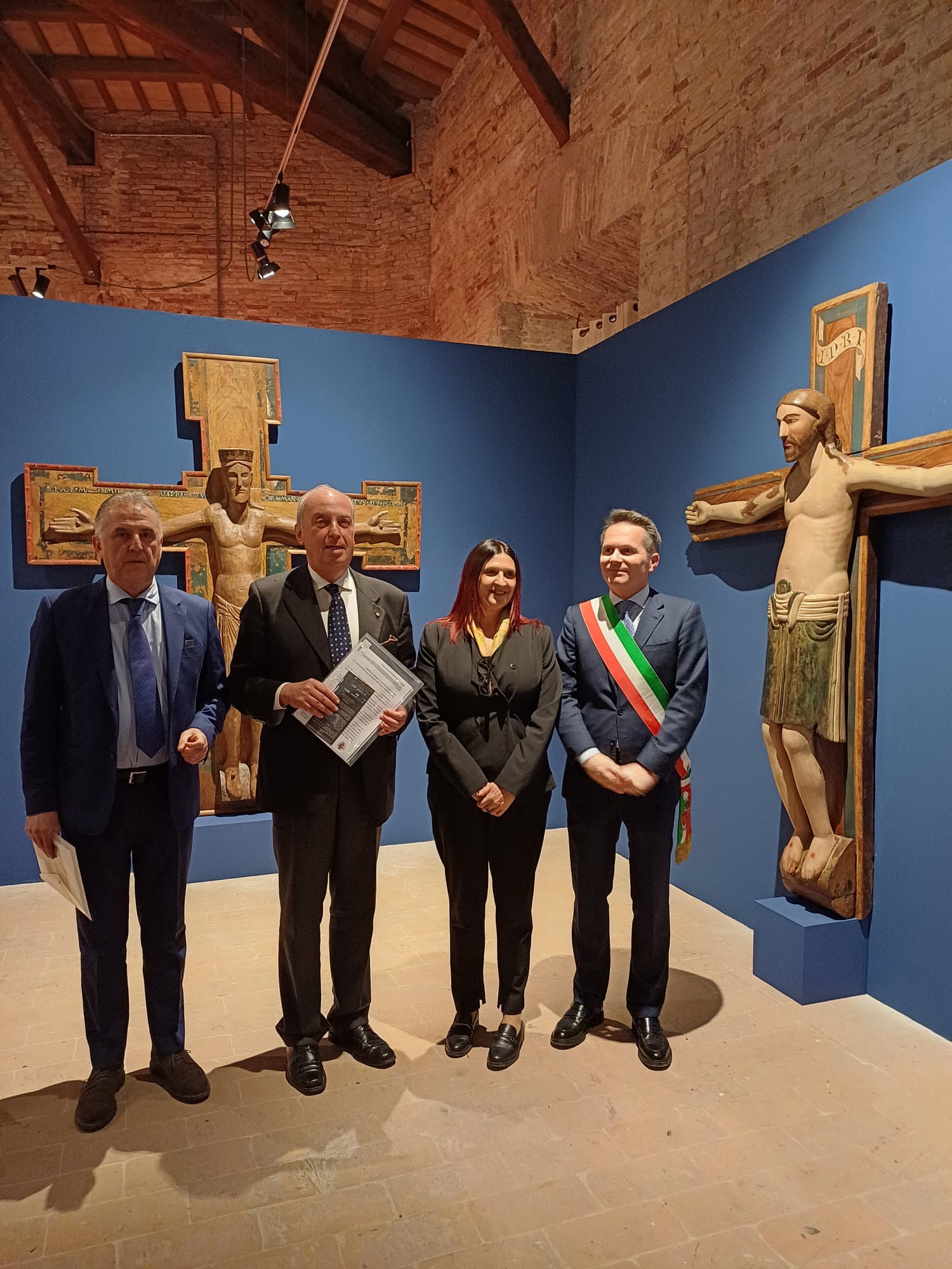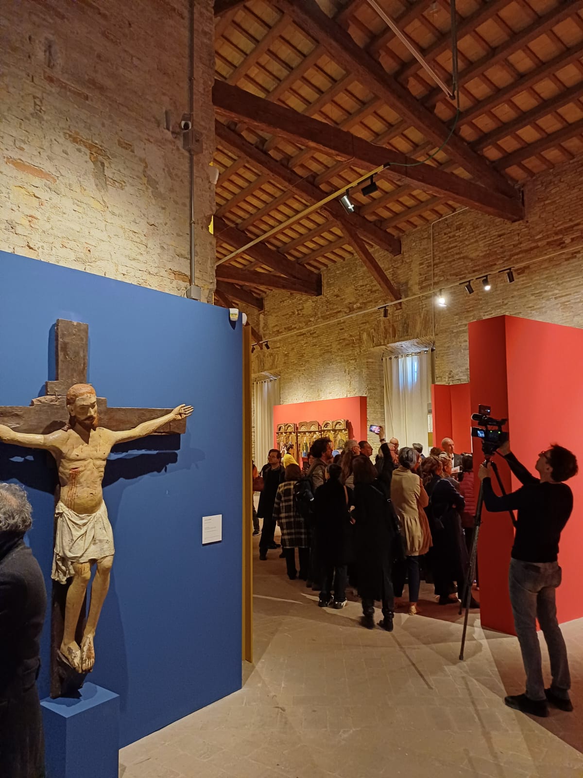 Nella prima sezione, dedicata alle opere medievali, tra i grandiosi crocifissi lignei spicca quello a rilievo su croce sagomata con cielo blu stellato realizzato per la chiesa paleocristiana dedicata al Santissimo Salvatore di Ancona (oggi Santi Pellegrino e Teresa, dopo i rifacimenti settecenteschi), restaurato da Maria Laura Passarini. Il Crocifisso, risalente al XIII secolo (legno di pioppo policromo cm 189,5 x 183; croce cm 249 x 206), è una delle opere anconetane presenti all’interno dell’esposizione. Questo rientra nella tipologia del Christus Triumphans come quello di Matelica, anch’esso esposto in mostra. Il Crocifisso di Ancona proviene dalla chiesa paleocristiana dedicata al Santissimo Salvatore, restaurata in epoca medievale tra il 1213 e il 1224 e poi conosciuta con il titolo di San Pellegrino per la presenza delle reliquie del martire Pellegrino rinvenute nella chiesa. In età moderna la chiesa parrocchiale officiata dai padri Carmelitani Scalzi venne demolita e ricostruita sotto il titolo dei Santi Pellegrino e Teresa (agli Scalzi) nei primi anni del Settecento. A partire dal secolo XII molte chiese d’Occidente si erano dotate di grandi crocifissi in cui il Cristo sulla croce veniva rappresentato vivo e trionfante in quanto Salvatore dell’umanità e così continuò a essere rappresentato in epoca romanica. L’intervento, reso necessario dalla presenza di gravi e diffusi segni di attacco xilofago pregresso e attivo che è stato causa di lacune nel supporto, è stato mirato alla migliore conservazione del bene, ma senza la ricostruzione di parti perdute nel corso del tempo.