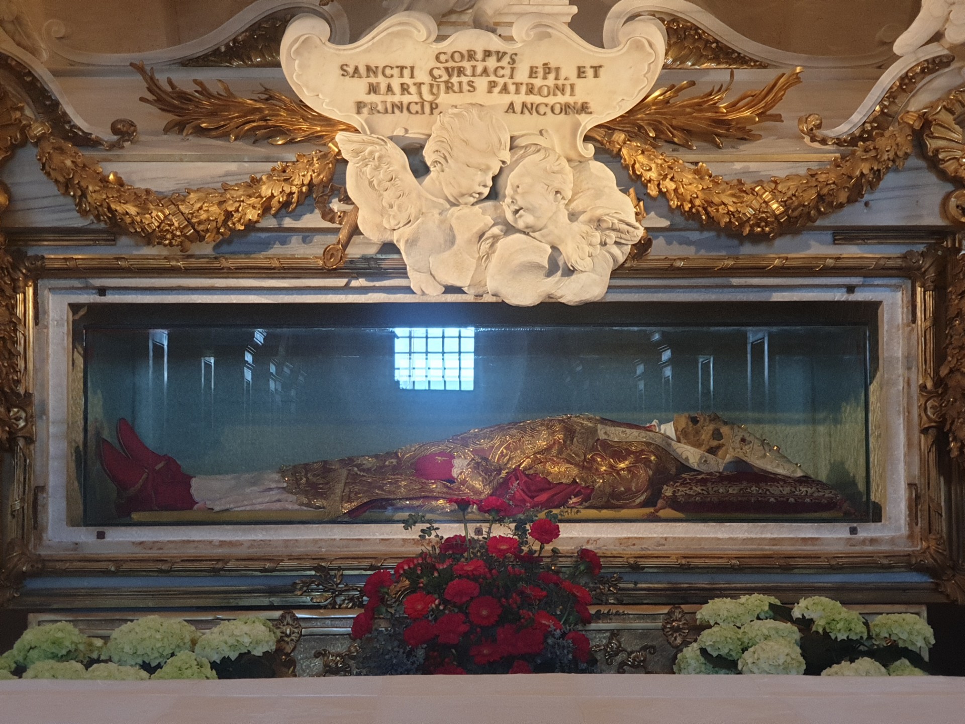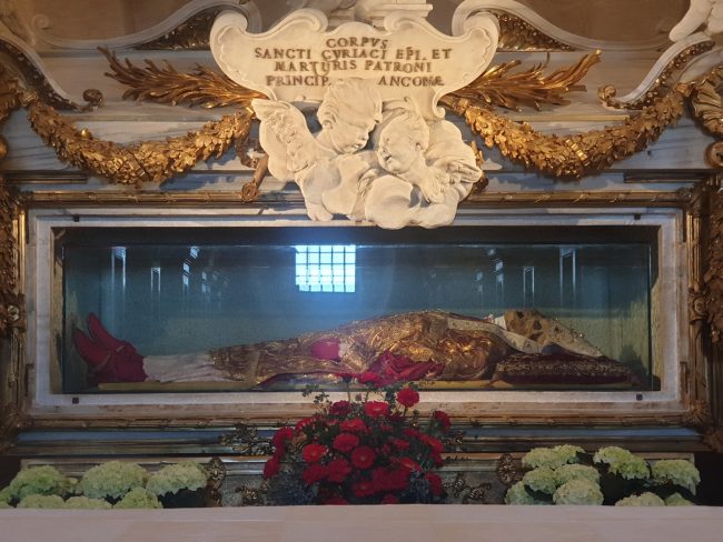 «Il 30 aprile 2025 sono state rese note le indagini e le analisi scientifiche sul corpo di San Ciriaco. È stato ancora una volta sorprendente vedere come ciò che la tradizione ci ha tramandato da secoli, ha trovato riscontro nelle analisi scientifiche. – ha esordito mons. Spina nel suo messaggio ai fedeli in occasione dei festeggiamenti patronali – I risultati ci aiutano ad avere più consapevolezza del grande dono che è stato fatto alla città di Ancona, di avere un santo che la protegge e veglia su tutti. Il corpo di un santo ci fa cogliere come la santità la si può toccare con le mani, è a portata di mano ed è per tutti. Papa Francesco, di venerata memoria, ci ricordava che anche i cristiani di oggi, a volte, pensano che il cammino verso la santità dipenda dai propri sforzi umani, dai propri sacrifici, dalla propria buona volontà. Non è una nostra iniziativa, ma una risposta a una chiamata che viene da Dio, che «ci ha amati per primo». Il nostro cammino verso la santità è dunque una risposta all’invito di Dio, il quale non solo ci rivolge questa chiamata, ma ci dà anche la forza necessaria per percorrere questo cammino».