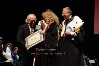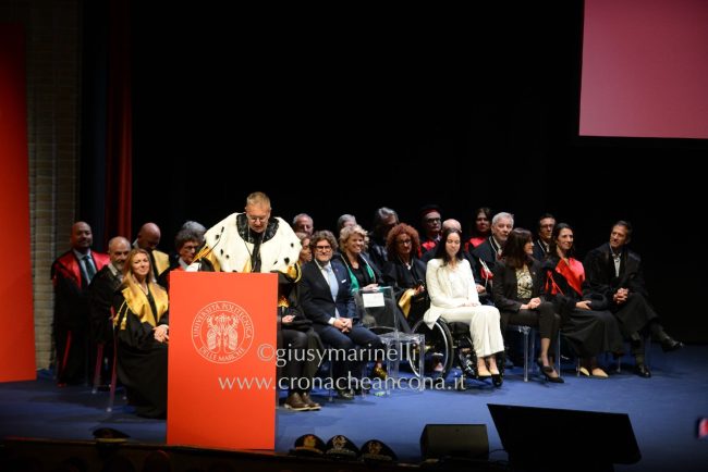 Emozionato per la cerimonia nella solenne location del teatro delle Muse ad Ancona, ha voluto accanto a sé, oltre a quella che ha definito la “famiglia del Rettorato” e i presidenti dei Dipartimento, quattro ospiti speciali. Oltre a Frida Bollani Magoni, il campione paralimpico Oney Tapia che, dopo aver perso la vista in un incidente, ha saputo ridefinirsi fino a vincere Ballando con le stelle e a diventare coach motivazionale per aziende e sportivi. Ma anche l’ex studente Univpm Nouha Zakariya, founder di Omniroad: «Come in tutte le famiglia di immigrati, ho incontrato tante difficoltà, acuite dalla sedia a rotelle. Le barriere mi hanno costretto a rinunciare a tanto, comprese opportunità di lavoro, per questo voglio fornire servizi che consentano una migliore mobilità». Per finire don Aldo Bonaiuto della Comunità Papa Giovanni XXIII che ha parlato del progetto delle marmellate “Redenta” realizzate dalle vittime della tratta. «Ho incontrato sulla strada una ragazza – ha raccontato – che si prostituiva per studiare. E’ molto grave».